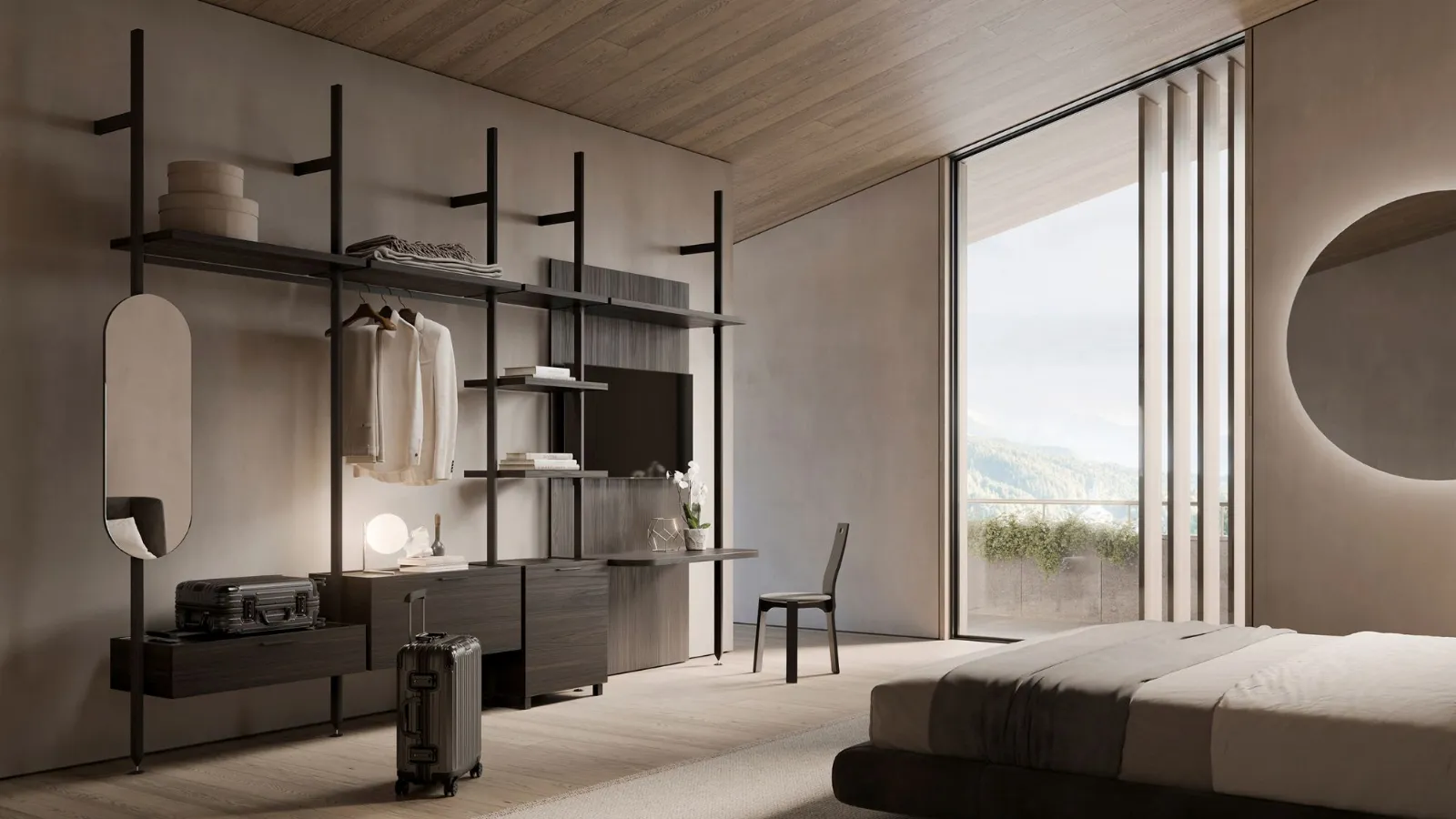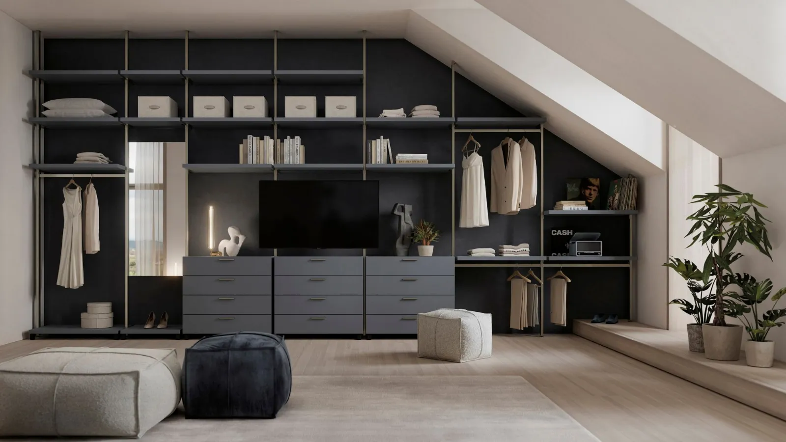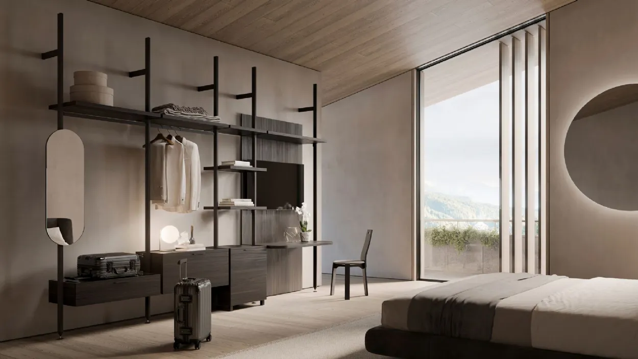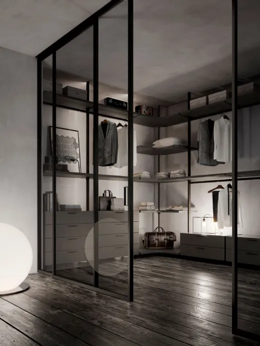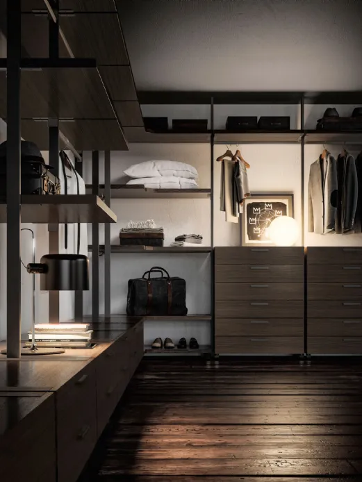 Its maximum expression is in the sleeping area in the realization of walk-in closets thanks to the high variety of interior components finishes that range from the practical melamine to the more elegant lacquered finish. The big range of the dimensions of straight or moulded shelves allows the realization of compositions that take full advantage of all the available space, both in width and in height.