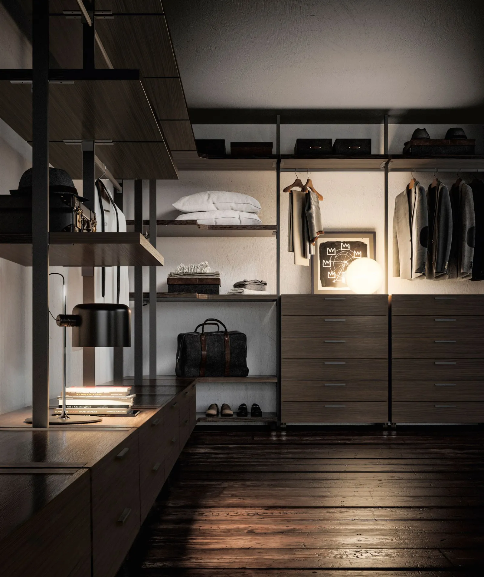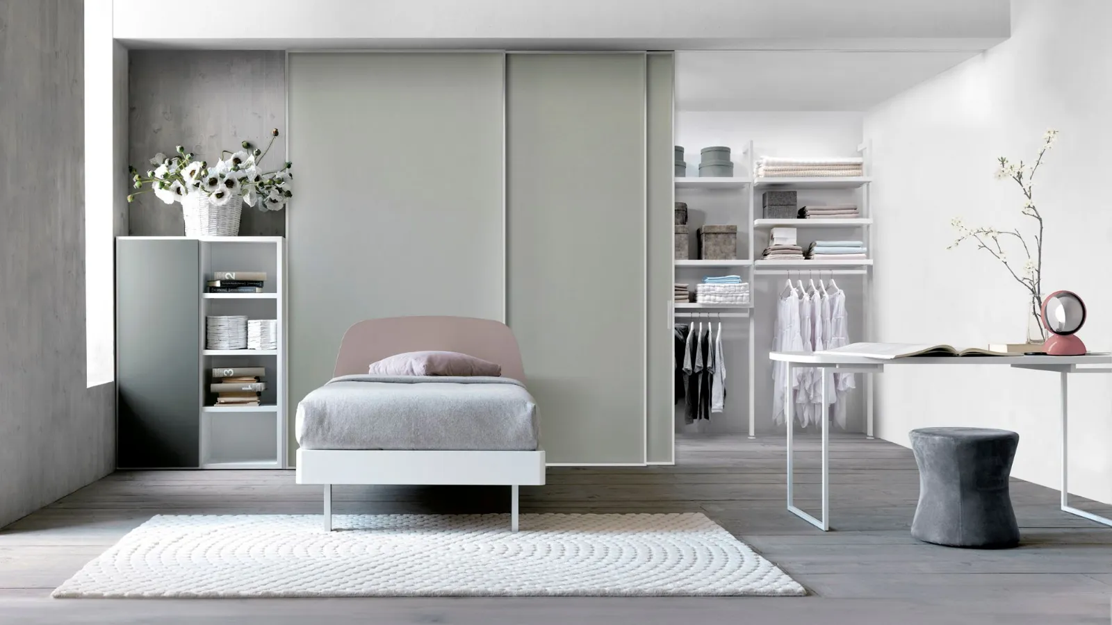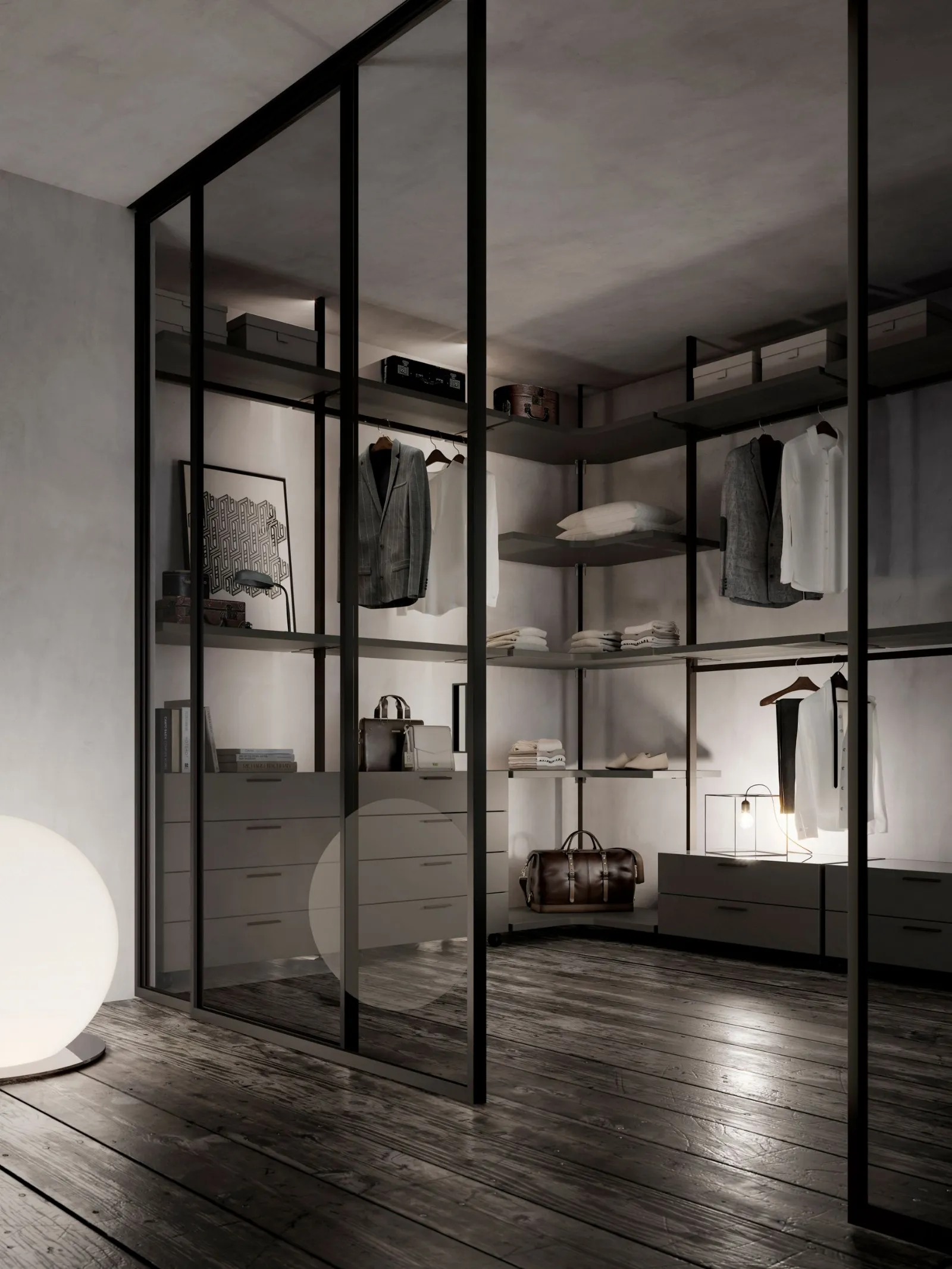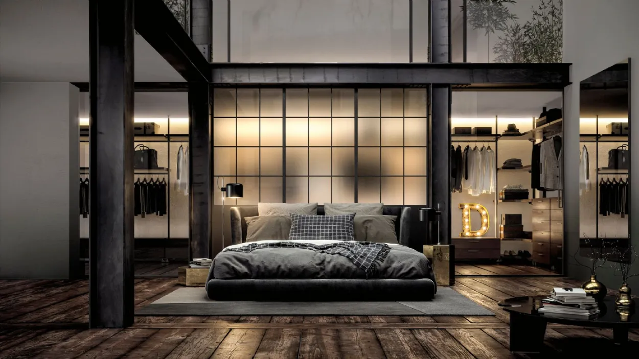 Its maximum expression is in the sleeping area in the realization of walk-in closets thanks to the high variety of interior components finishes that range from the practical melamine to the more elegant lacquered finish. The big range of the dimensions of straight or moulded shelves allows the realization of compositions that take full advantage of all the available space, both in width and in height.
