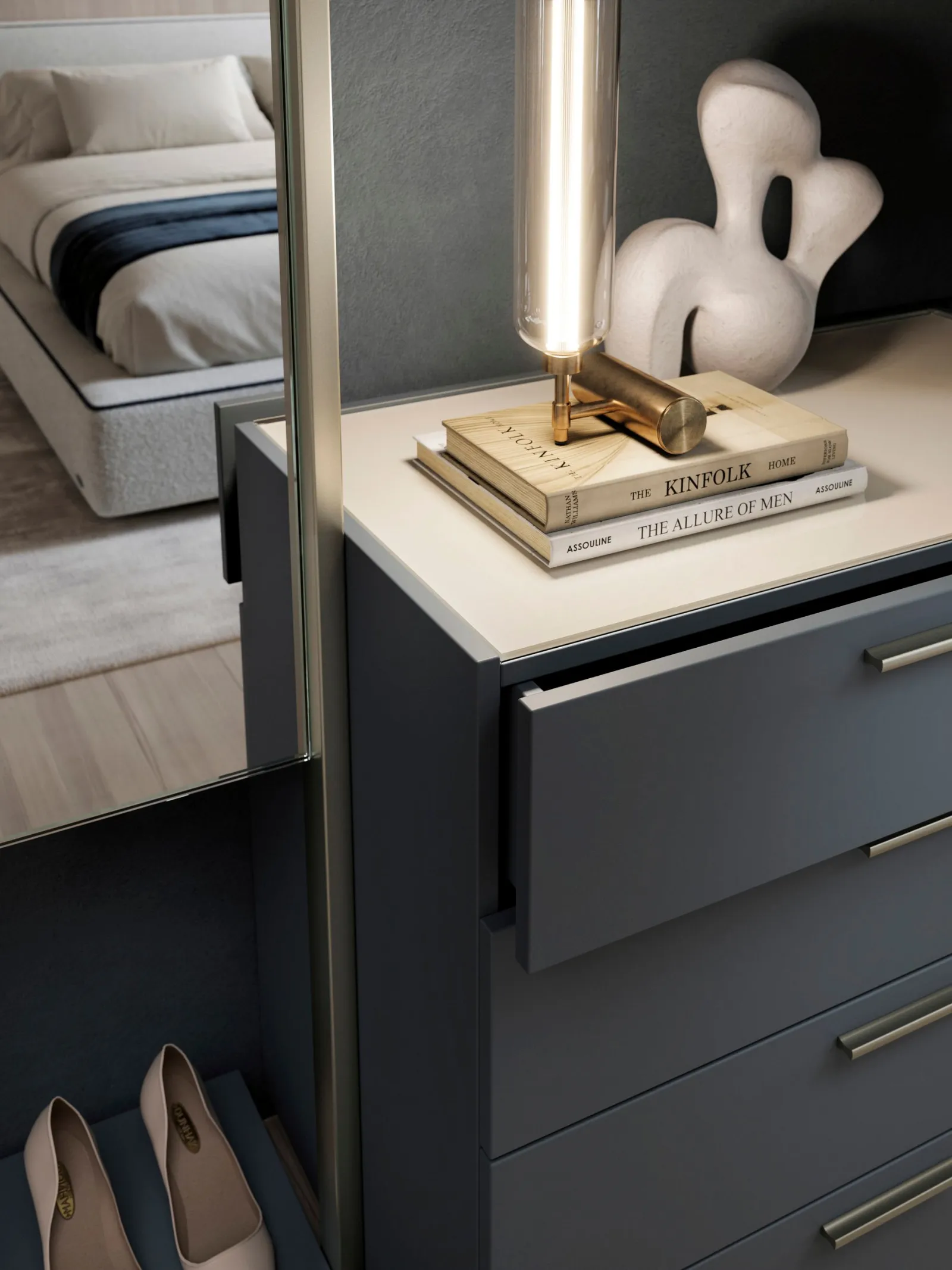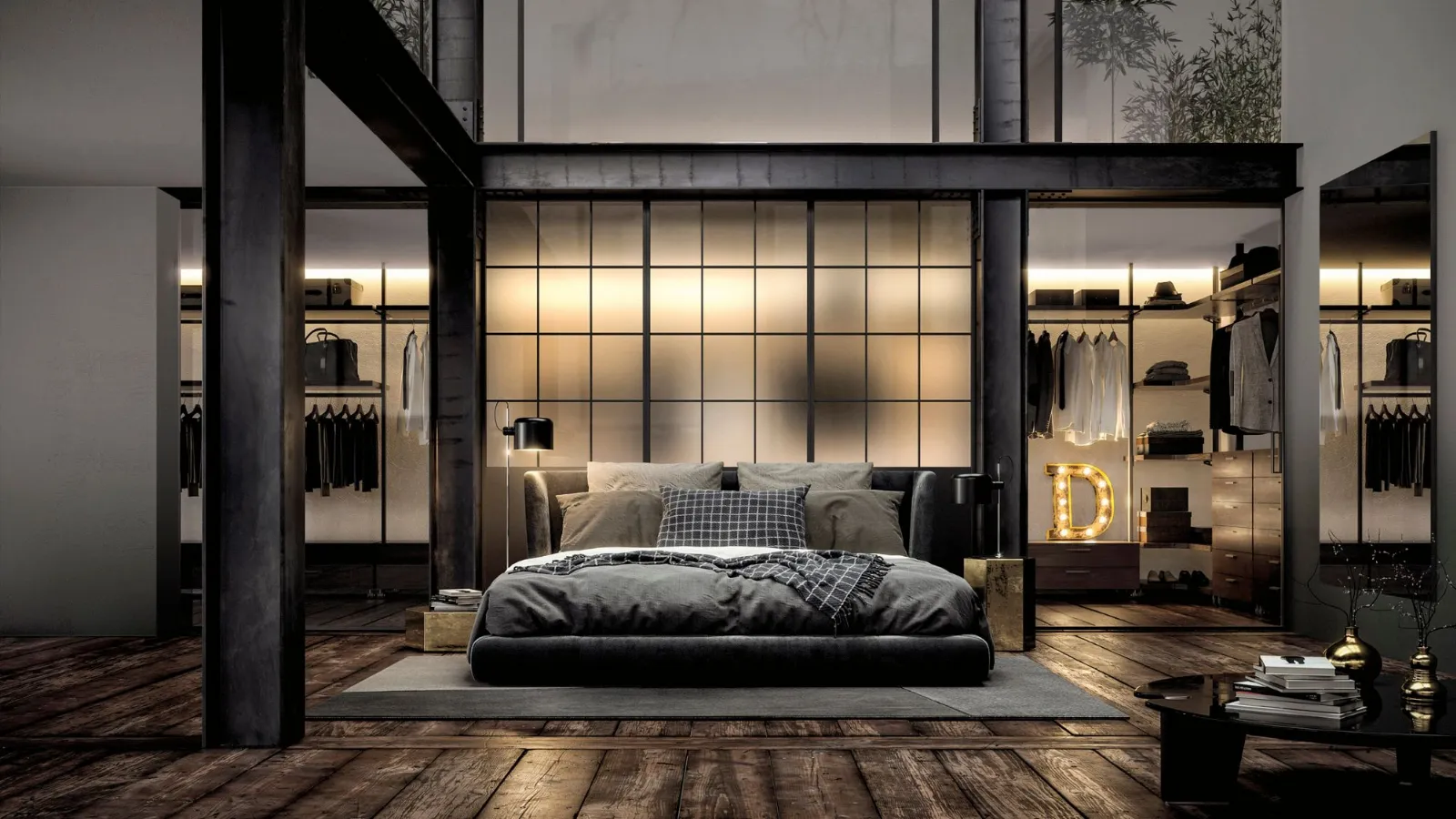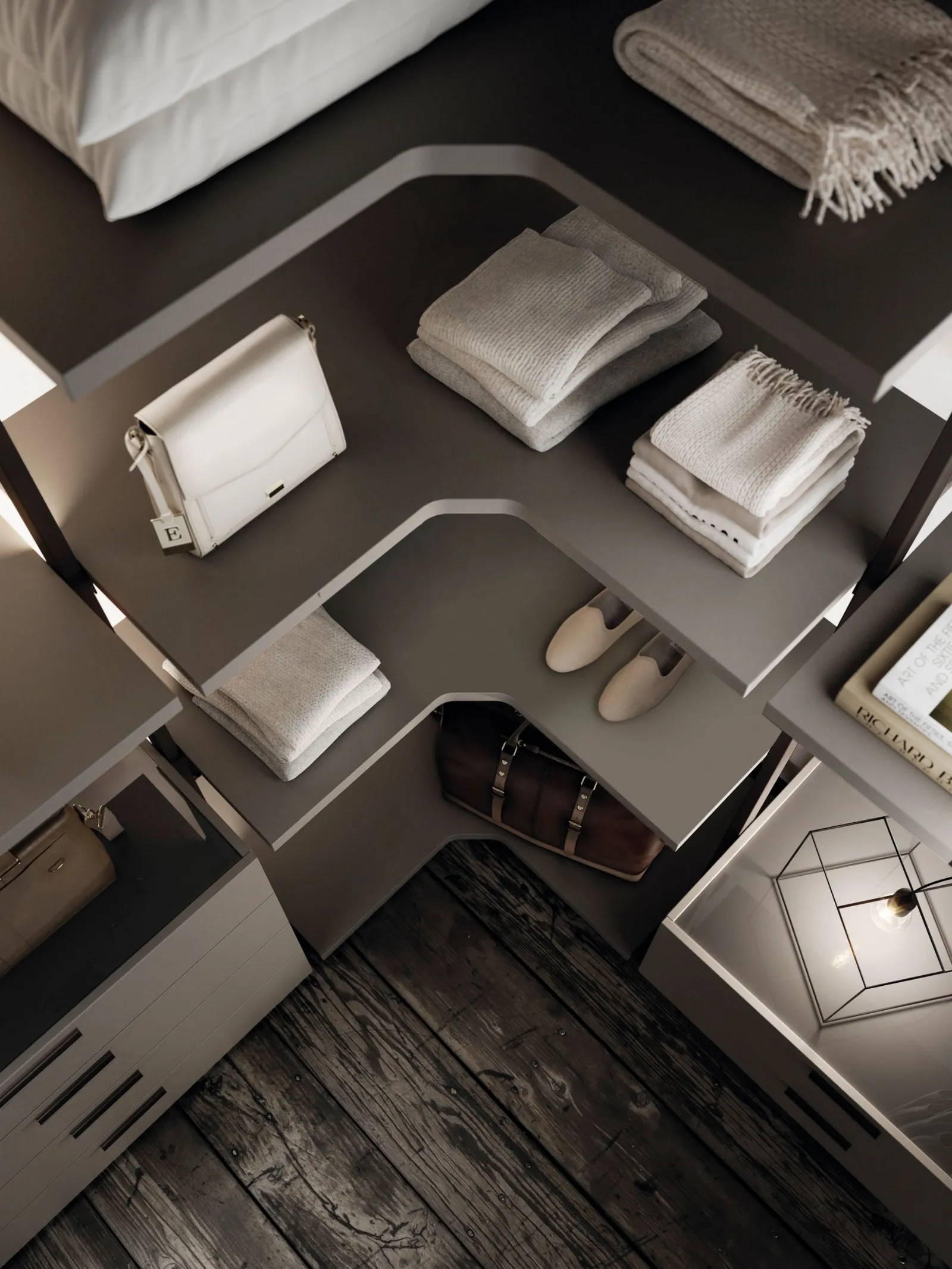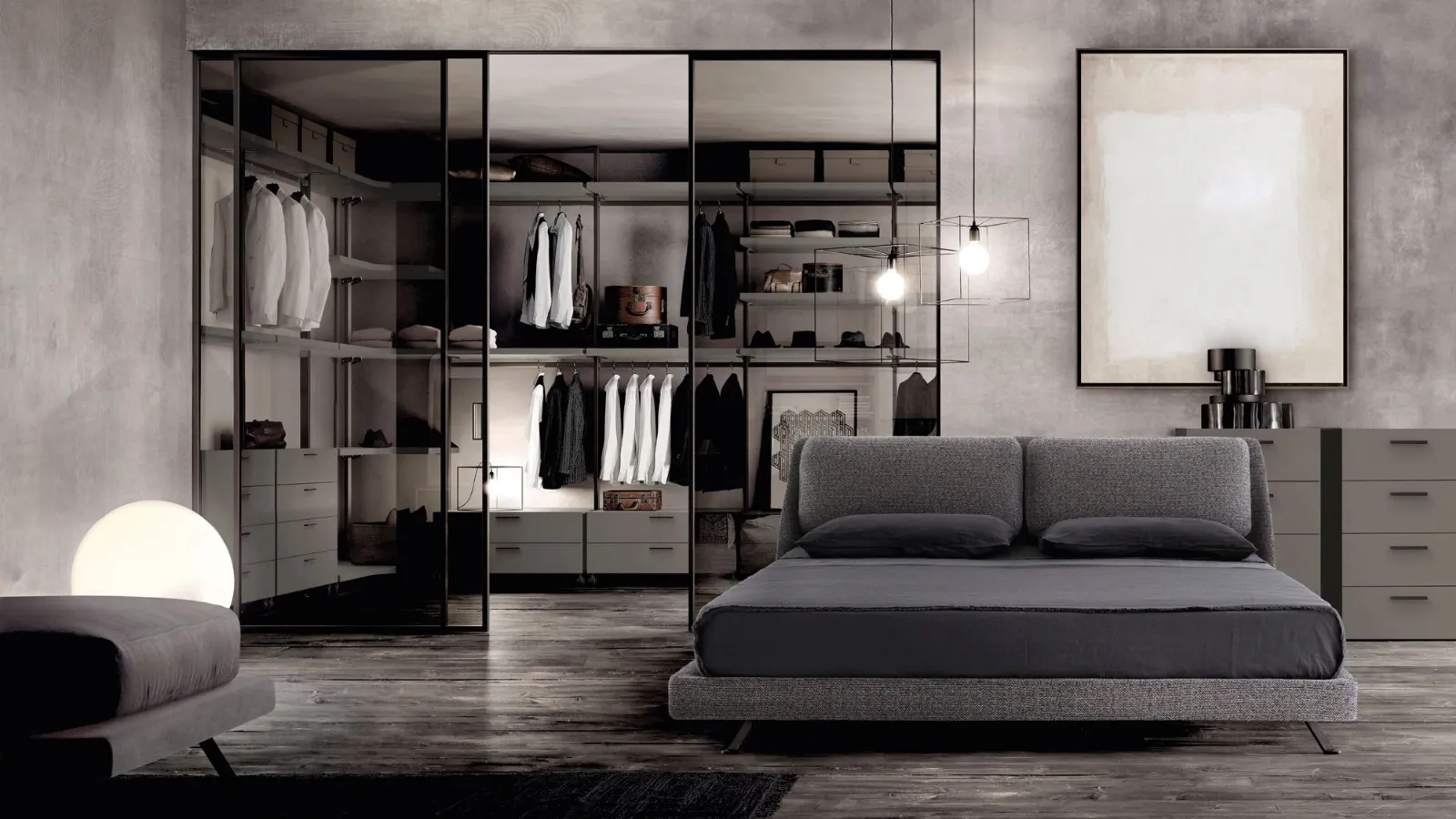 Its maximum expression is in the sleeping area in the realization of walk-in closets thanks to the high variety of interior components finishes that range from the practical melamine to the more elegant lacquered finish. The big range of the dimensions of straight or moulded shelves allows the realization of compositions that take full advantage of all the available space, both in width and in height.