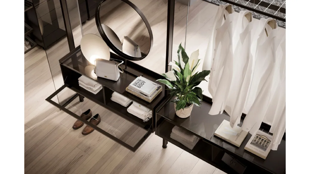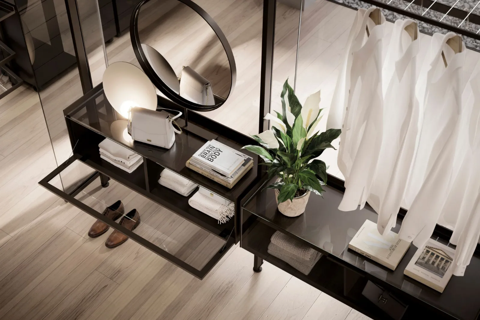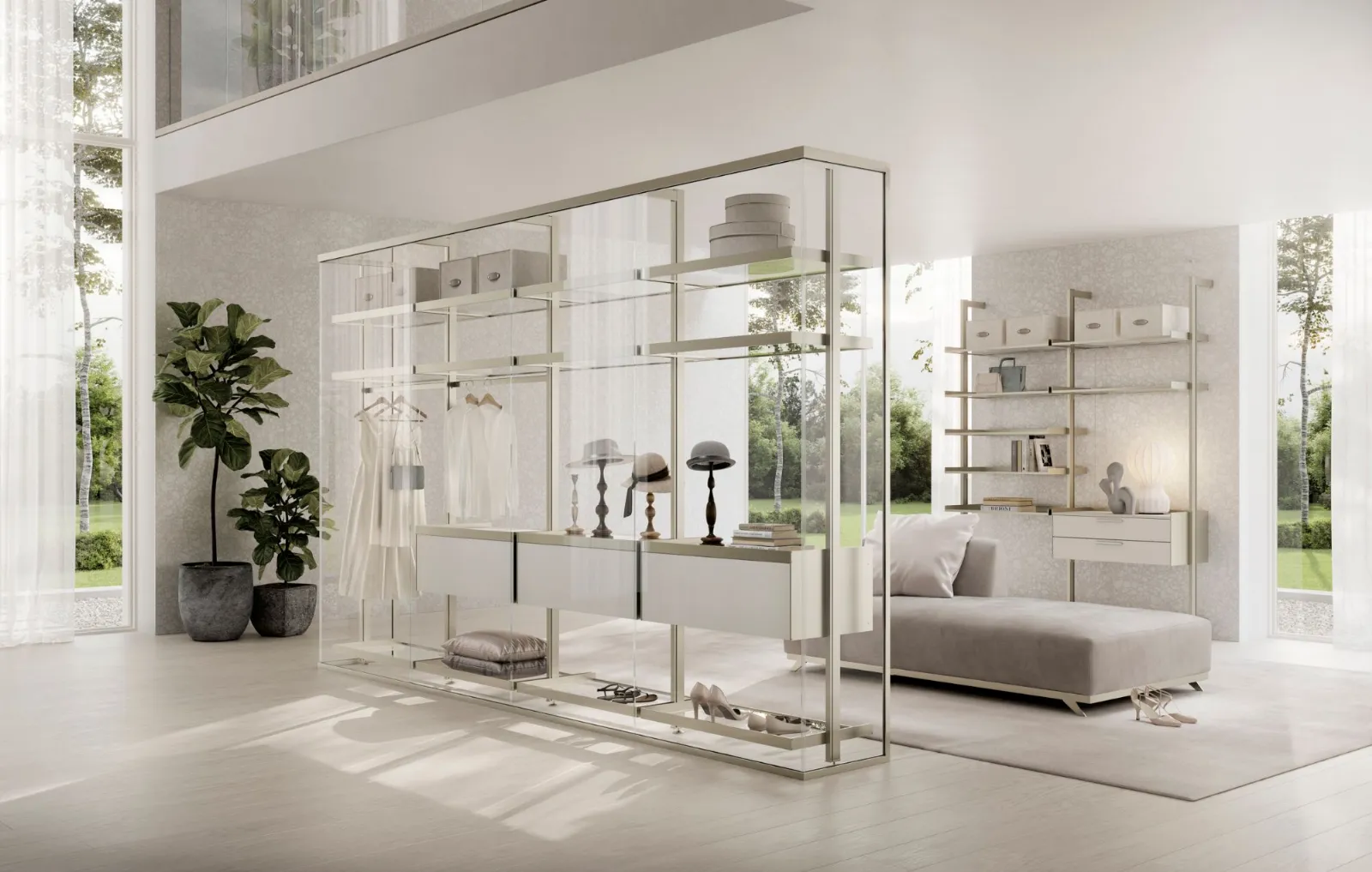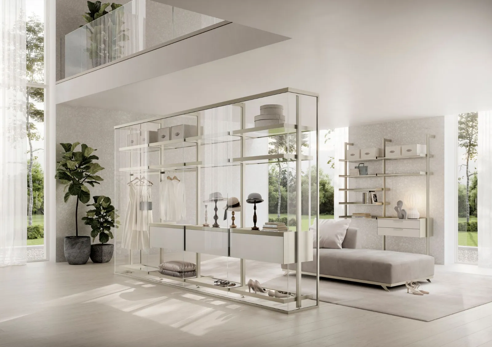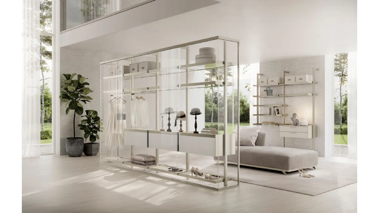 The Kristal wall solution wraps and defines the Venere walk-in closet with its profiles in Champagne aluminum and Extra clear Transparent glass. The profiles in the same finish, the shelves always in Extra clear Transparent glass, and the Tortora lacquered drawers complete and characterize a solid design element that is a divider with transparencies and reflections that enhance the environment.