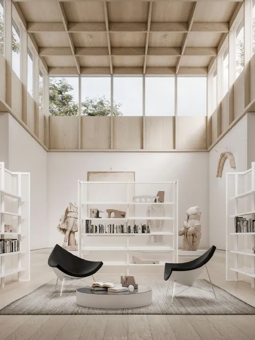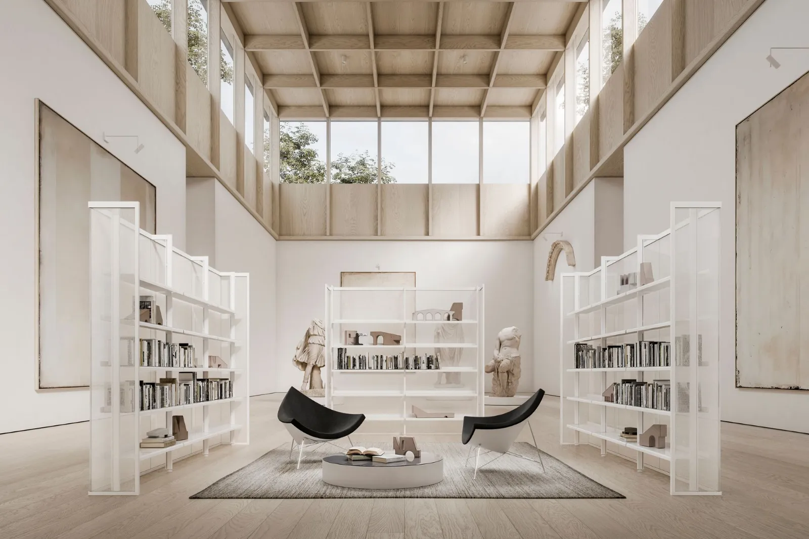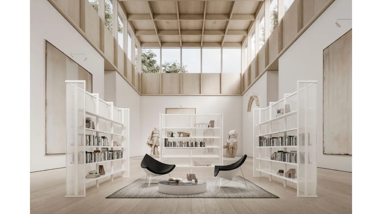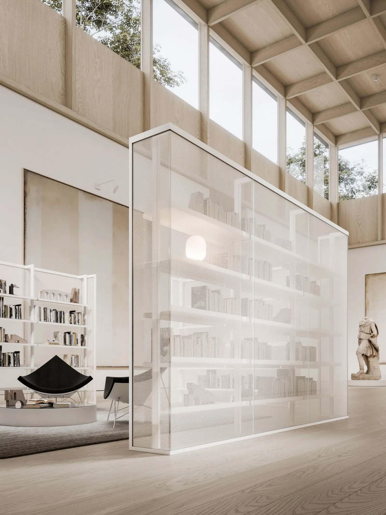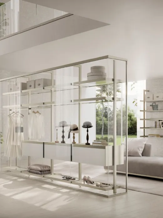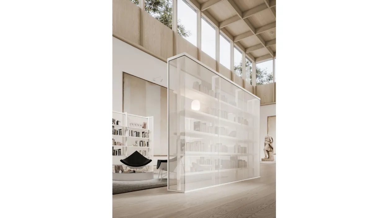 The Kristal wall is ideal for offices, hotels, shops, exhibition spaces, homes or other environments where a bright and refined atmosphere is desired. Kristal can be integrated with the Karin bookcase with painted steel shelves, but also with the Venere and Simply bookcases. In addition, in living spaces, walk-in closets can also be integrated.