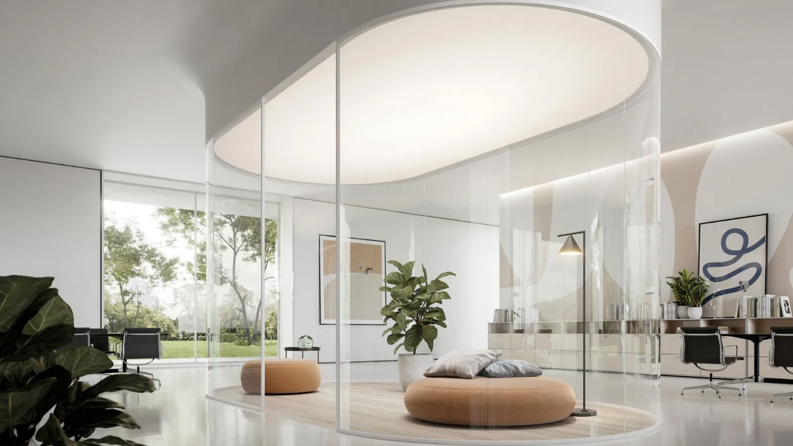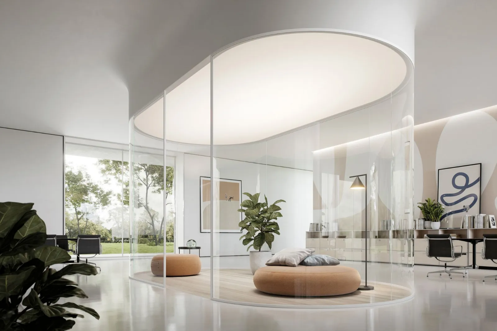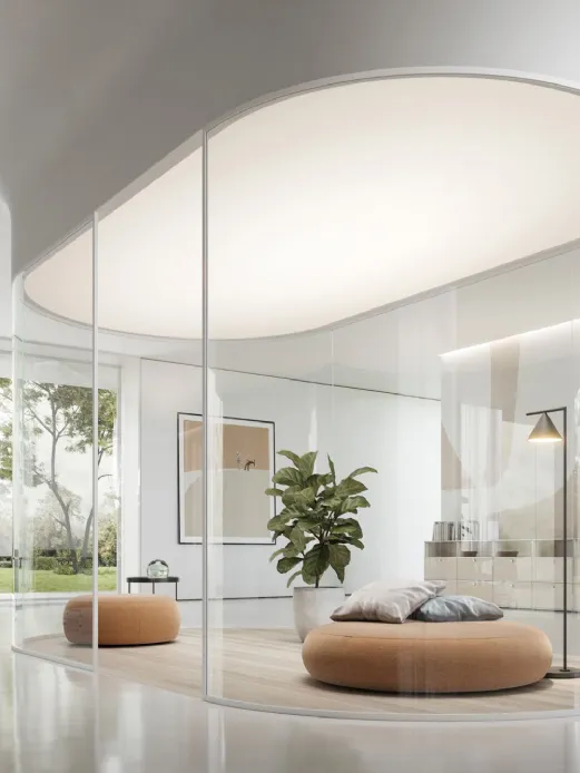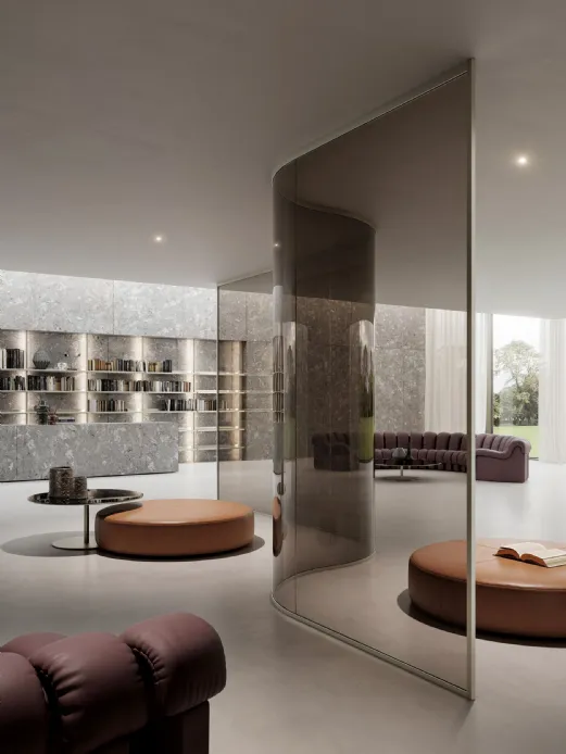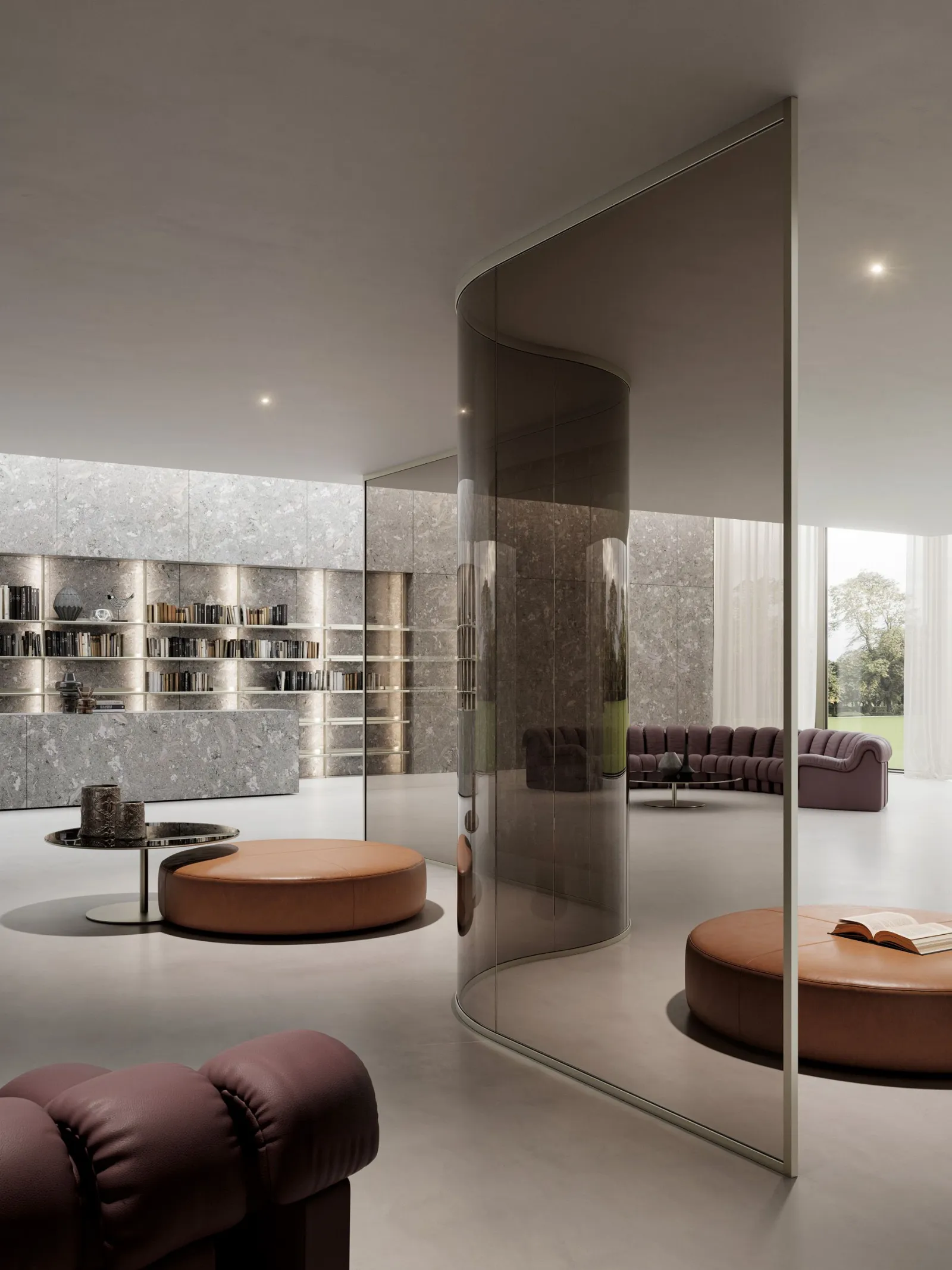 The curved Tao wall creates private spaces, unique architectural volumes, shared spaces that can also double as high-class relaxation areas, redefining the environment with elegance by creating visually impactful forms.