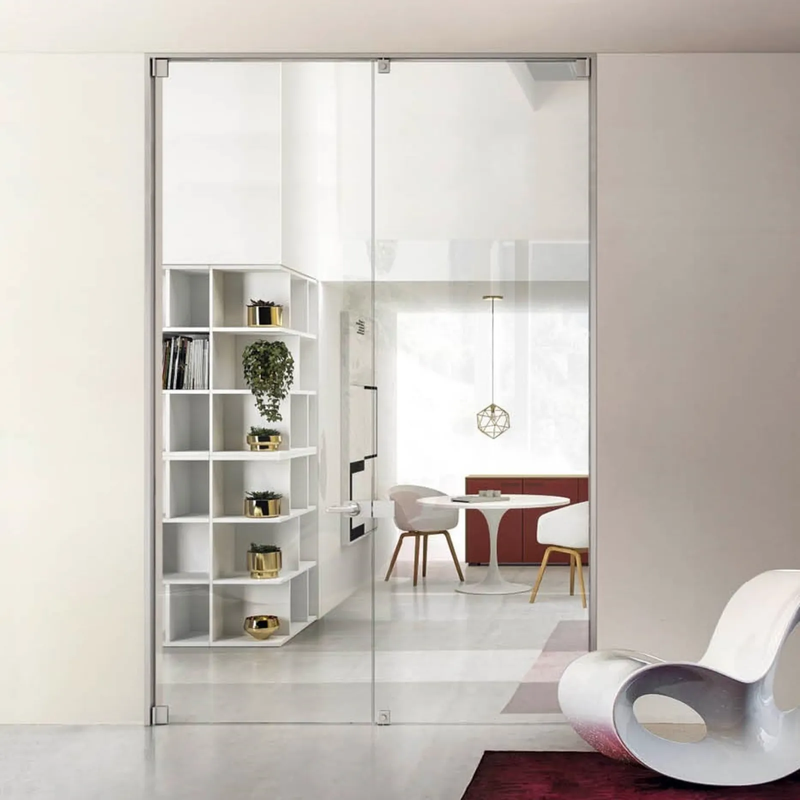 For example, the concealing sliding door for subframes is in high demand: door panels slide on the inside, optimizing the available surfaces. An excellent alternative is the sliding door with floor-mounted or ceiling-mounted rail.