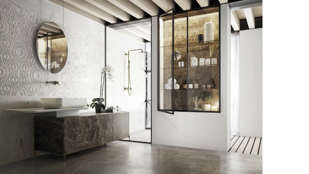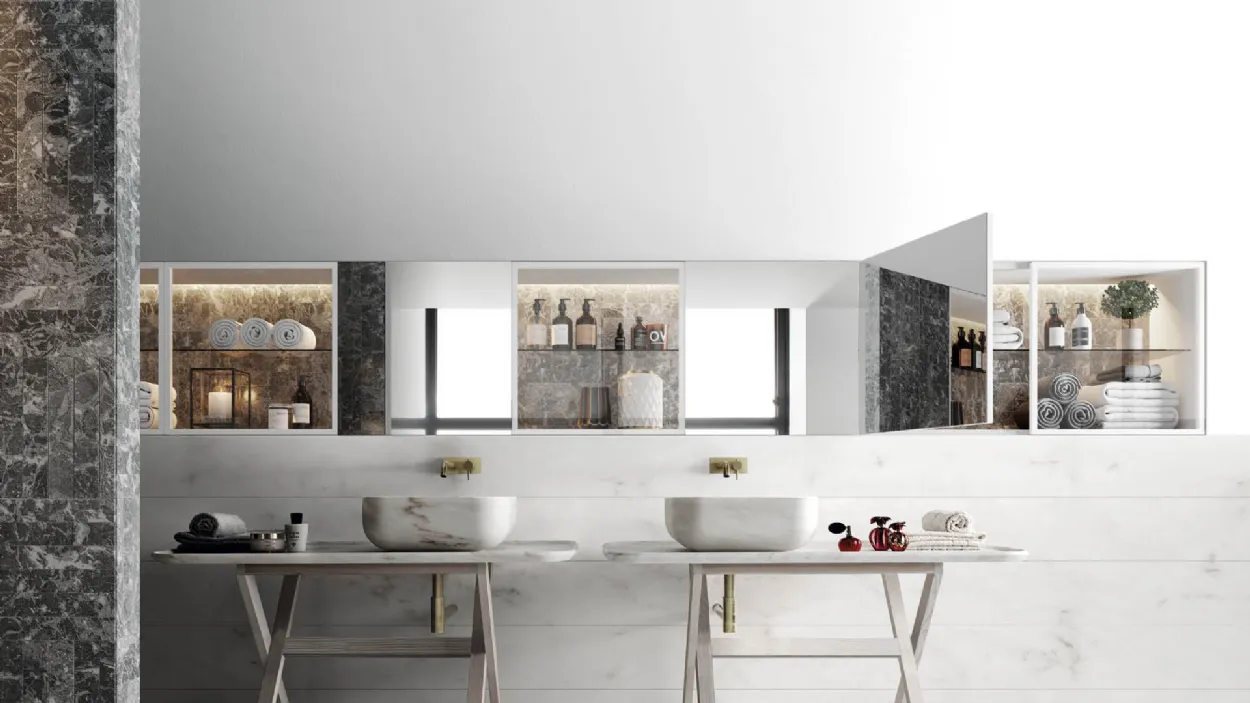 An original idea by Doal the one of using wall flush niches even in the bathroom environment, where the space is always limited. The wall flush niche allows exploiting the space that is inside the wall, enriching it with blind or transparent doors to bring to life an aesthetic and functional effect. Walls with wall flush niches can be fully tailor-made in height, width, and even depth. It is possible to insert glass shelves or also leave the compartment empty. In the use case of bathrooms, it is advised to position a mirror door above the sink.