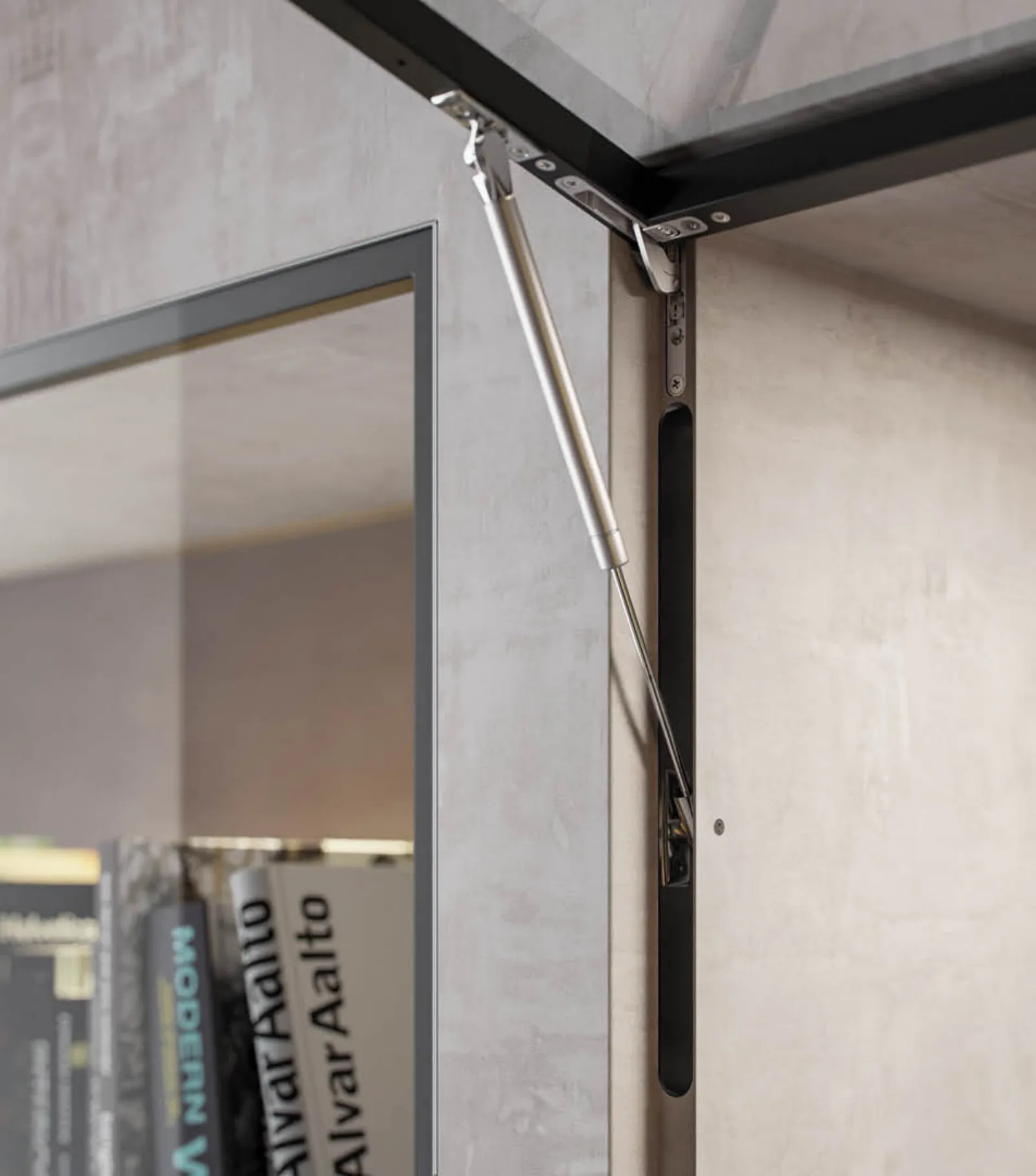 Mechanisms used in the wall flush niche system by Doal are studied and patented to be completely invisible and hidden in the designated container recessed in the plasterboard and perfectly integrated into the wall with its specific profiles. Niches can be illuminated with spotlights in the middle of the compartment or with led strips that can be installed horizontally or on the sides, based on personal needs and preferences. They are perfect for home environments, hotels, and for shops where to expose precious items as you would do with actual glass cases.
