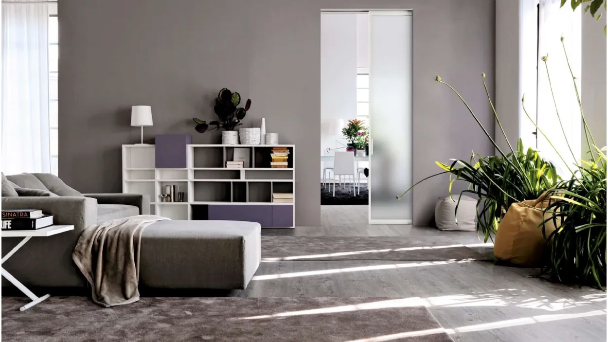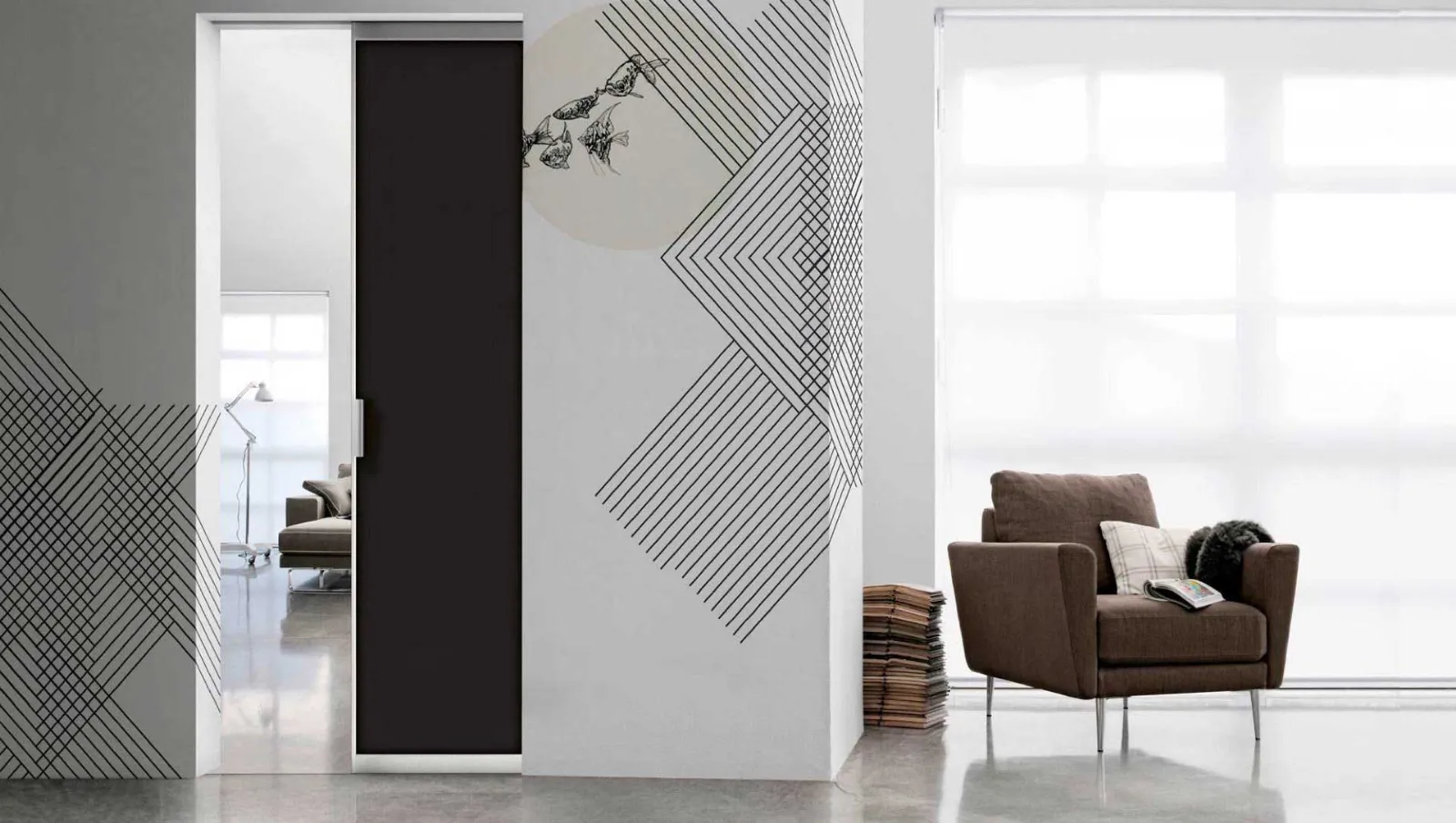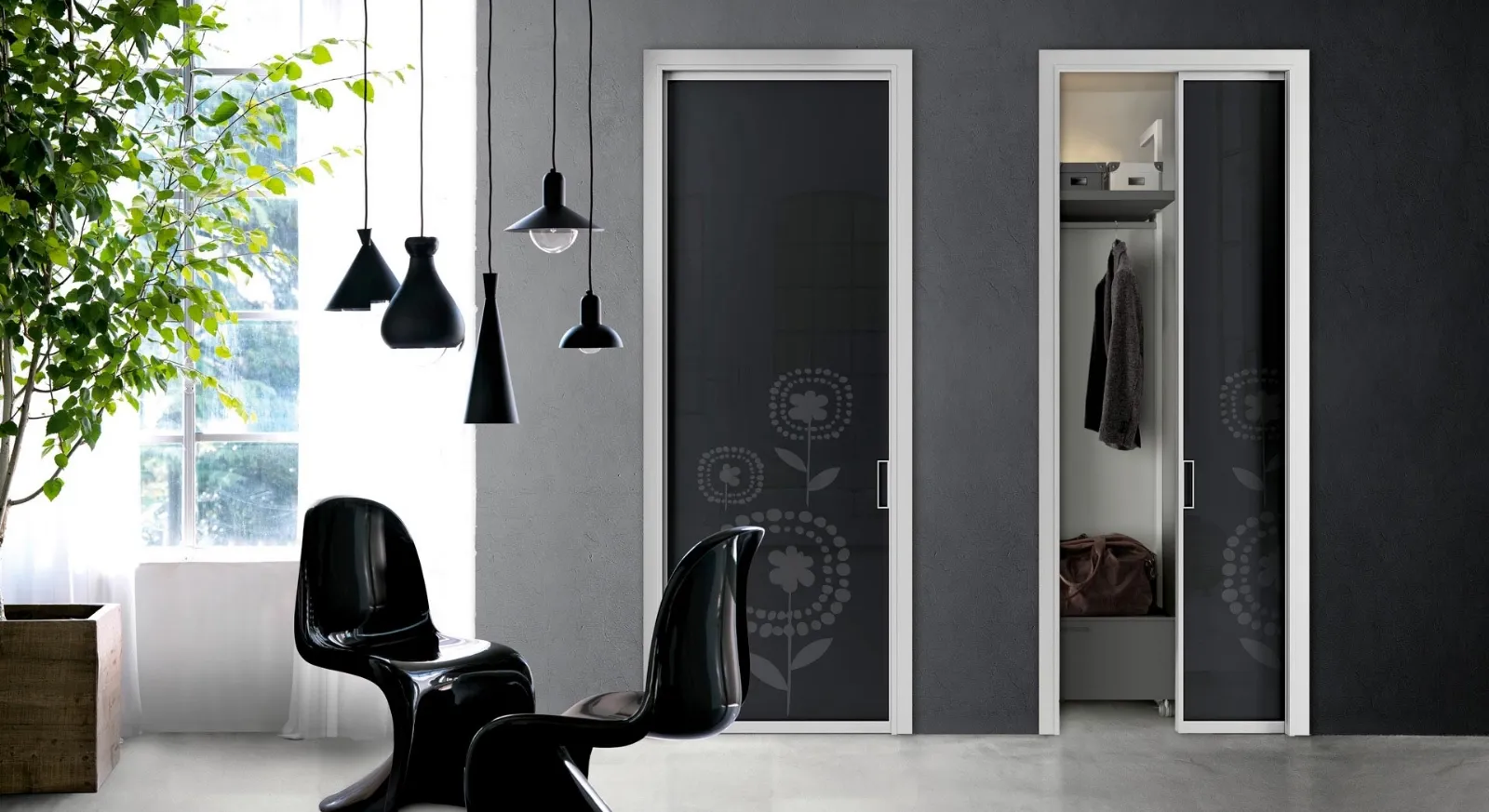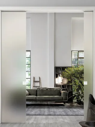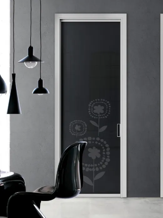 Made of wood, glass, or glass with an aluminium frame. Glass is always popular since it makes the environment brighter: ideal especially for spaces with a limited surface area. Proposals offered by Doal can be applied to different subframes that are available in the market. Traditional sliding doors have aluminium jambs that also work as a frame for the passageway. There is the possibility to choose this specific jamb to match the door frame in silver, white, brown, and anthracite colour. As for glass doors, Doal also produces different decorations that can be applied to the door surface; this is a way to provide the door with personality and customize even more your own house. Other than increasing the brightness of the space, they can also be tailored with company logos, drawings and decorations, chromatic contrasts effects, a creative freedom that translates into a unique furnishing element.