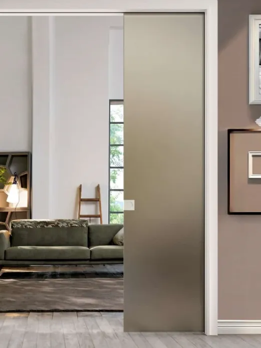 One of the main advantages of these doors is to fully disappear inside the wall, letting the passageway completely free from any obstruction. The characteristic of exploiting spaces, united to the light that a satinized glass instills, finds ideal solutions in this door for reserved environments and usually with low light, as a bathroom, an under-stair closet, a storage room, a small office, a small bedroom, etc. We care to let you know that we are tied to tradition, offering also the possibility of realizing door panels completely made of wood, lacquered, or to be painted.