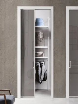 These doors create an effect of high lightness and accuracy, disappearing completely in the wall where they are hosted in. Wall flush doors can be requested in wood, in glass, or in glass with an aluminium frame. This wall flush concealed sliding system offers the advantage of defining with the highest lightness the transfer between two environments. The sliding concealed system is used more and more in modern environments. Wall flush concealing doors distinguish themselves from traditional doors because they do not have any external frame, resulting in a more modern design and aesthetic.