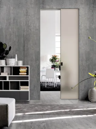 The wall flush concealing door is particularly suitable for small environments where the space is essential. The absence of jambs, which by default are in the traditional door container, makes this a minimalist design product. Available doors for this system have an aluminium structure united to a panel or to glass and can be applied to various subframe brands that are in the market. One of the main features of wall flush concealing doors is the functionality since it gets the most out of the space available inside the wall. The main advantage of these doors is to fully disappear inside the wall, leaving the passageway free from any obstacle. The feature of exploiting limited spaces together with the characteristic of a glass of spreading light to the inside finds the highest ambition for this door in environments where privacy is needed, together with brightness at the same time.