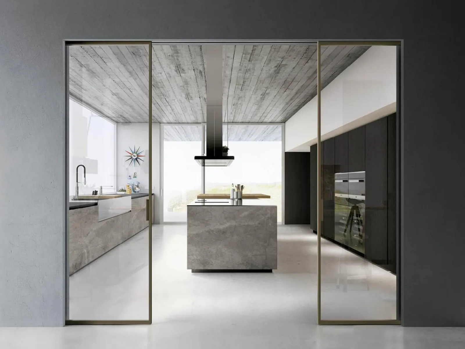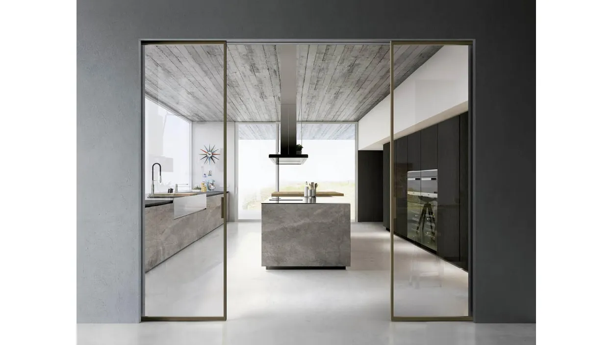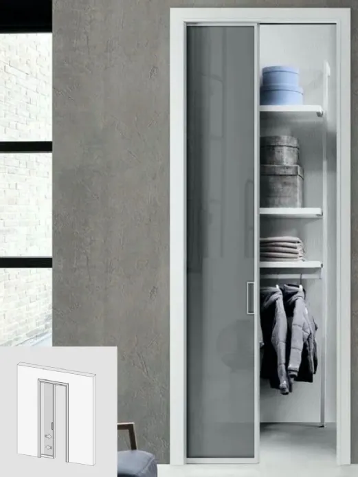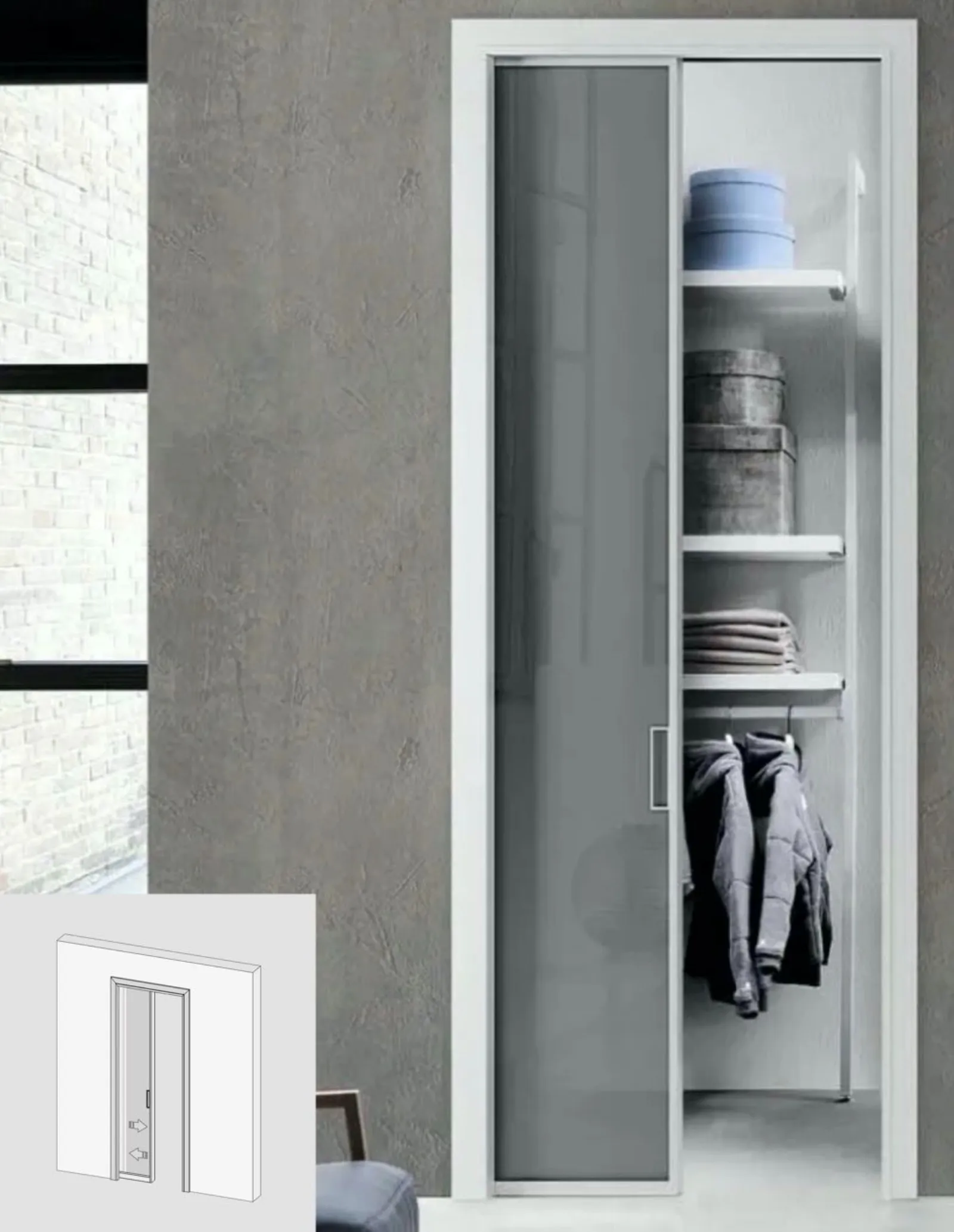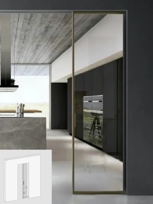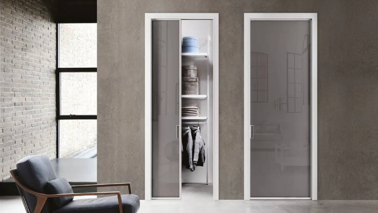 Concealing sliding door ZEUS adapts to traditional subframes, that expect jambs, or wall flush type, without jambs. The squared aluminium perimetral profile characterizes this door, that can have several glasses or panels.