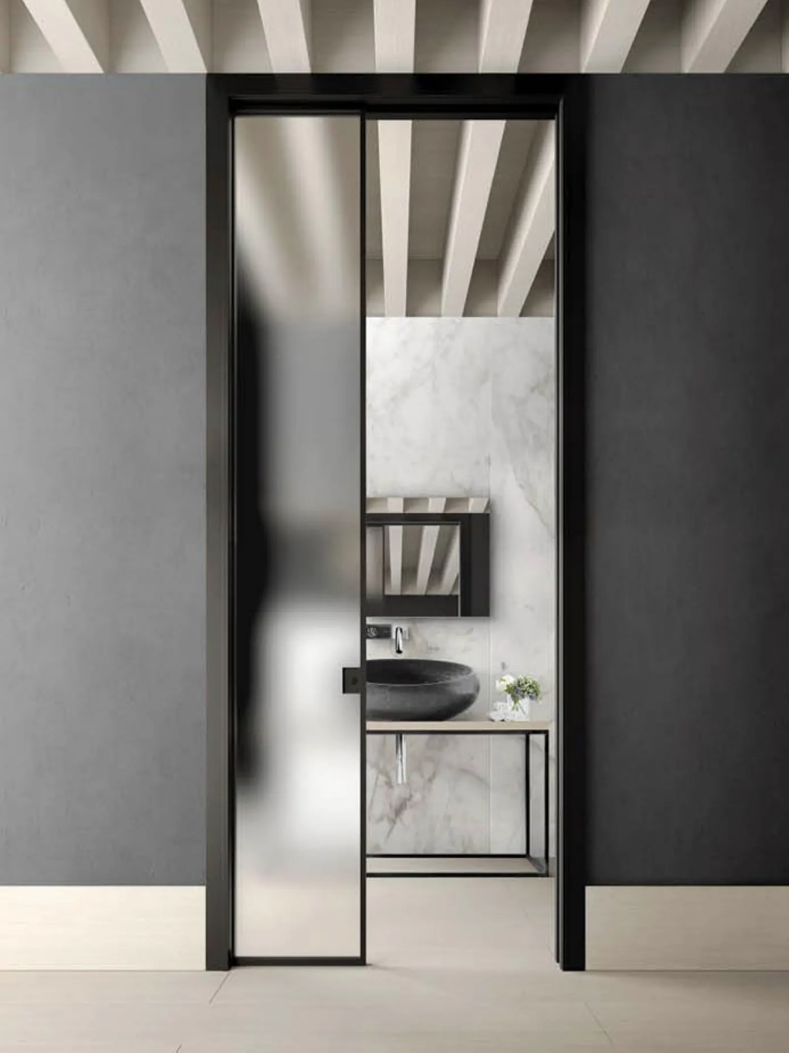 Concealing sliding door ZEUS is an ideal solution to furnish with style a decisively modern environment where a subframe for concealing doors is installed. In the version with jambs, these perfectly match with the perimetral profile of the door. This kind of solution is used very often as an entrance door in a bathroom, perhaps with satinized glass that lets the light pass through, without being able to see through the door.
