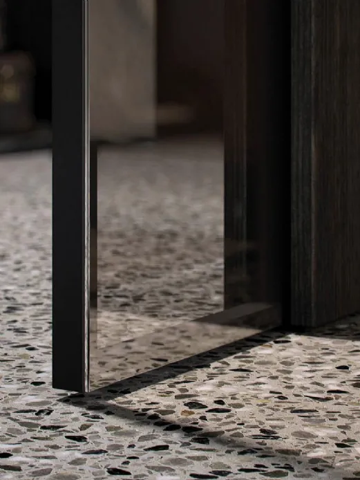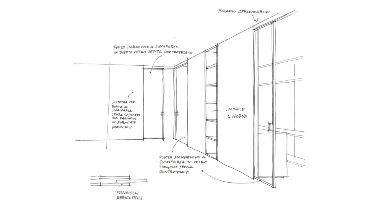 The flush glued glass of the aluminium profile is the big feature of the GAIA model. In the sliding concealing solution on a wall flush subframe, this detail is even more highlighted thanks to the absence of perimetral frames and rails in sight. On the inner side instead, the squared and minimalist aluminium profile is visible.