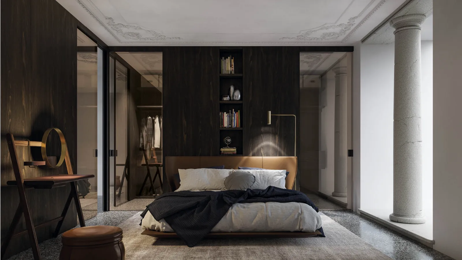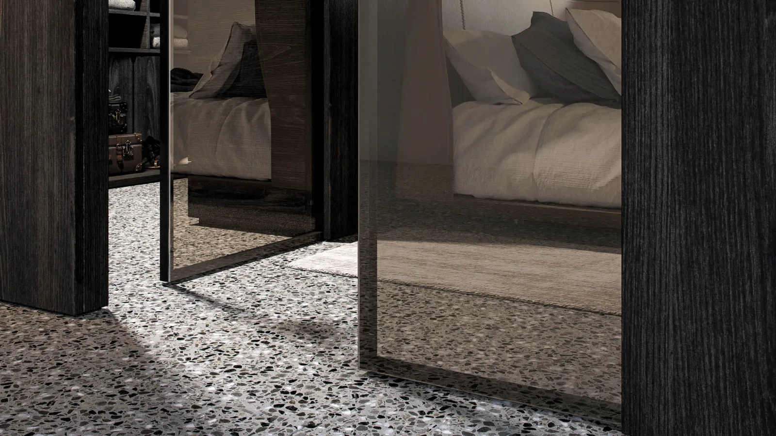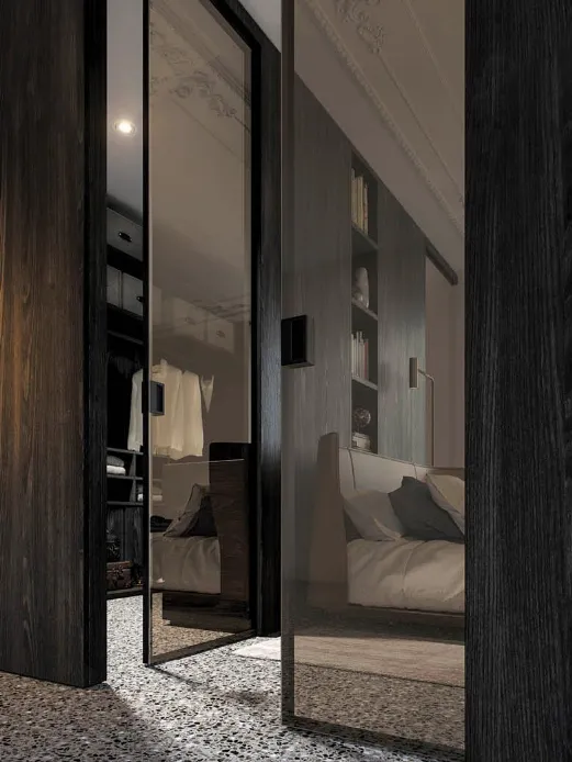Sliding concealing door GAIA with reflex glass is particularly indicated as closure for a walk-in closet. This way, looking at the door from the main side of the bedroom, the glass reflects the light when the light inside is turned off, and then it lets seeing through when the light is on in the walk-in closet.