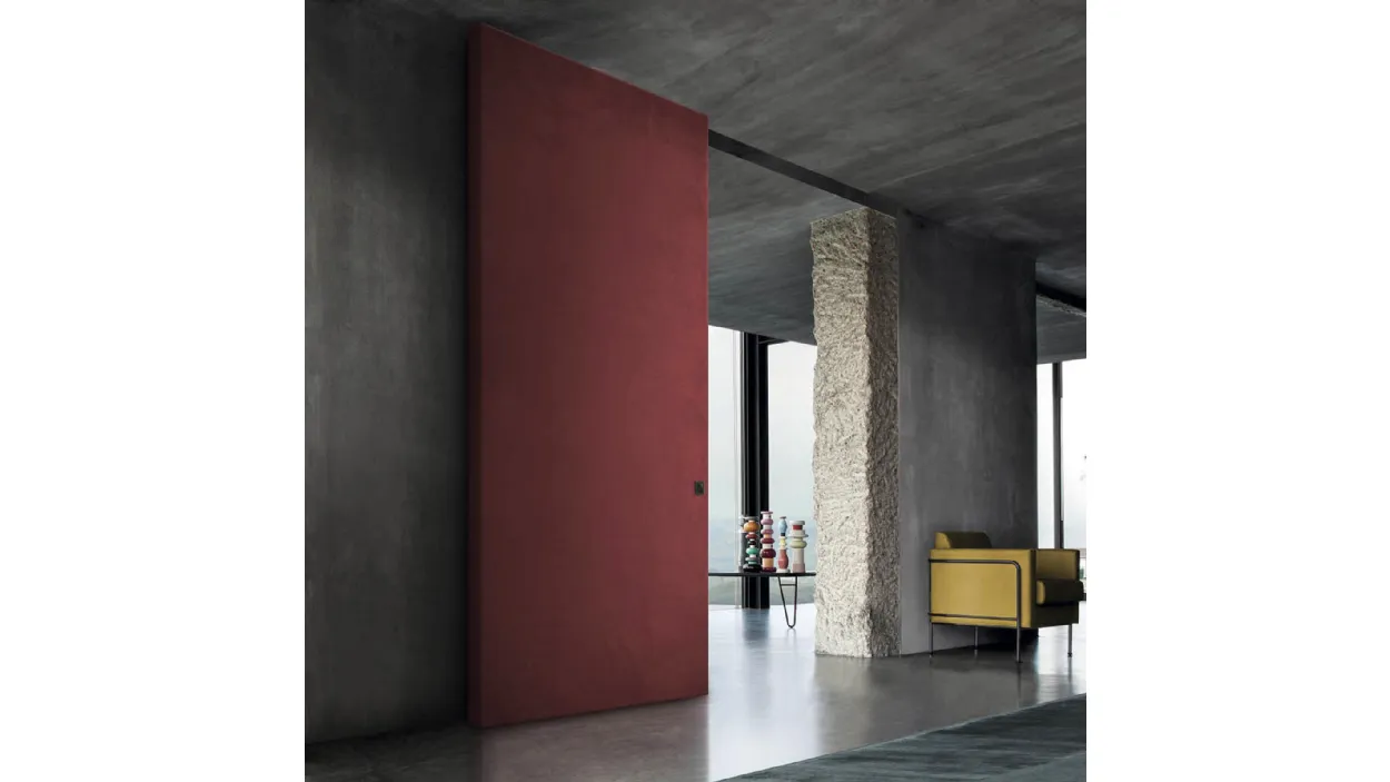 The sliding invisible door GEA is available in laminated material, lacquered material, to be covered with wallpaper, or to be painted like the wall. In the latter, as in the image, the effect of a part of the wall that shifts is obtained, without the perception of having a door that divides the two environments.