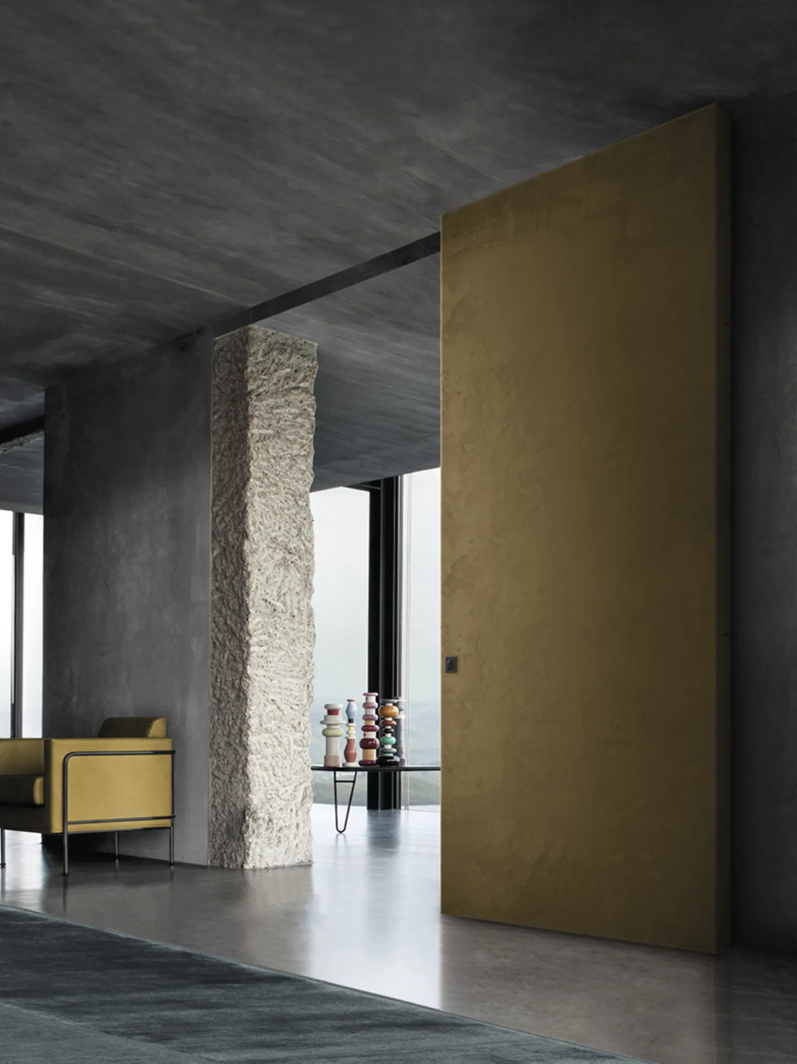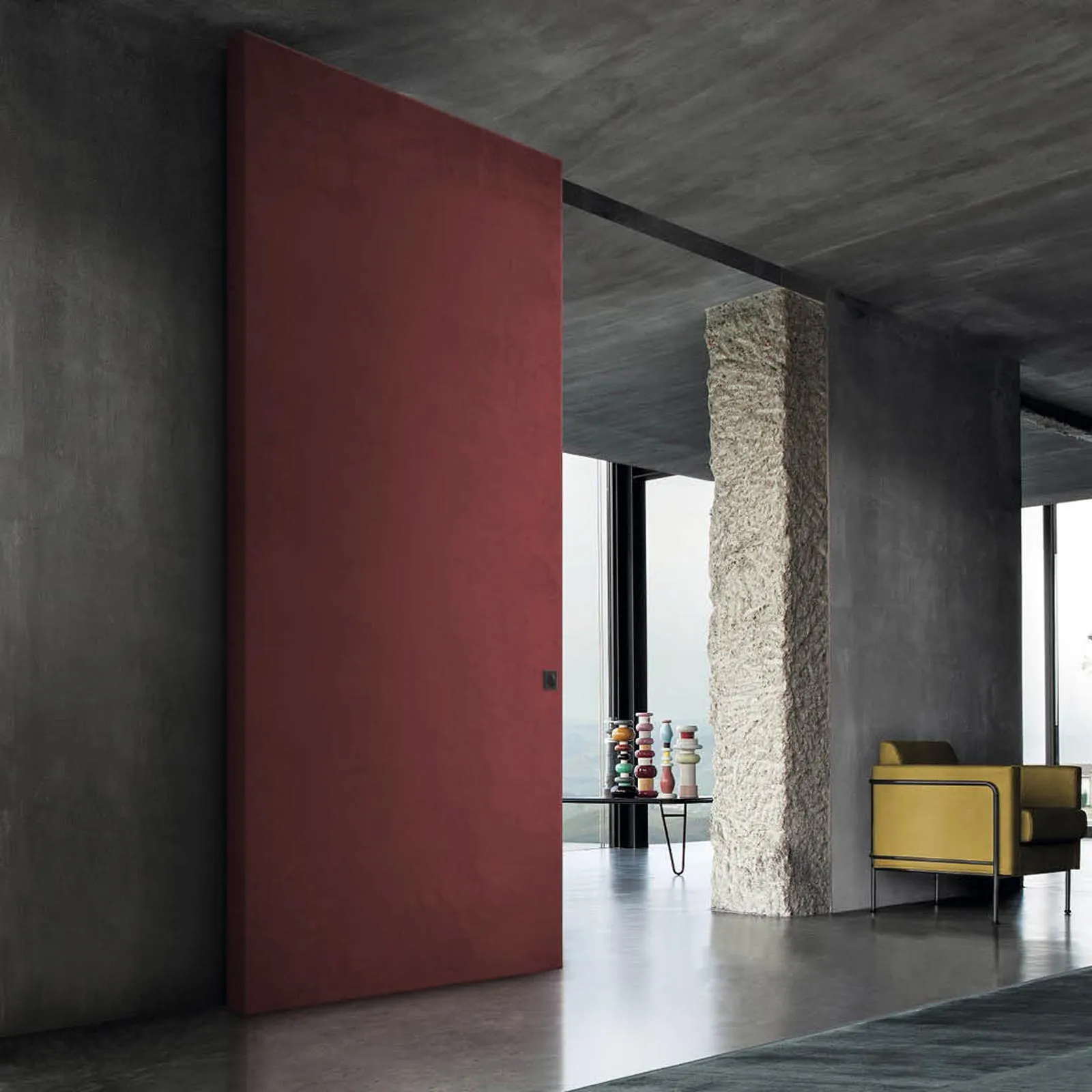The sliding invisible door GEA opens the passageway sliding on the lateral wall thanks to a hidden mechanism that provides extreme aesthetic cleanness to the environment. The rail of the invisible sliding door is fixed on the door and is mounted on a wall bracket.