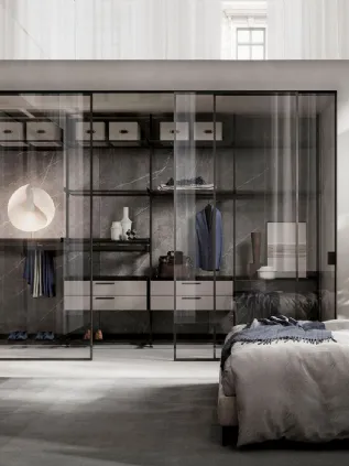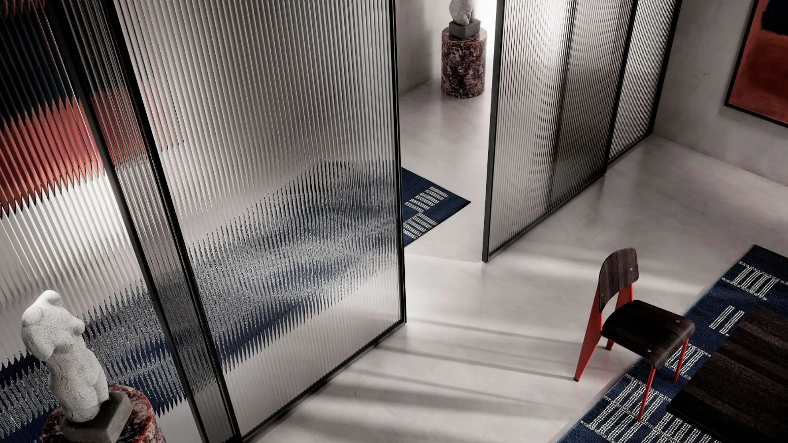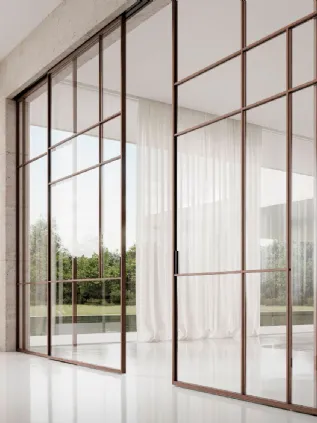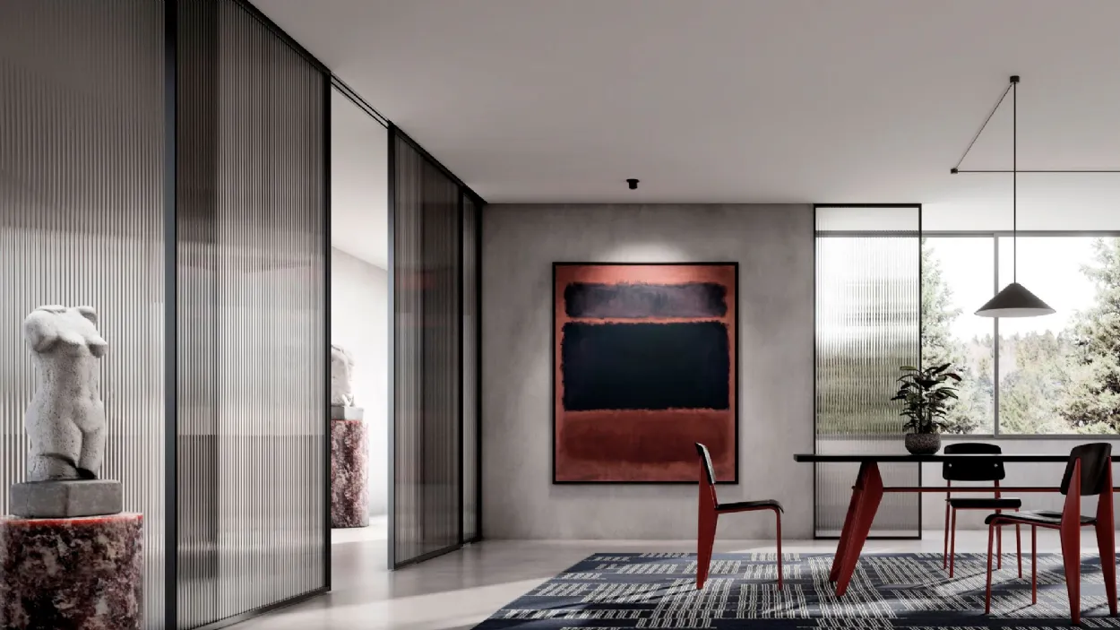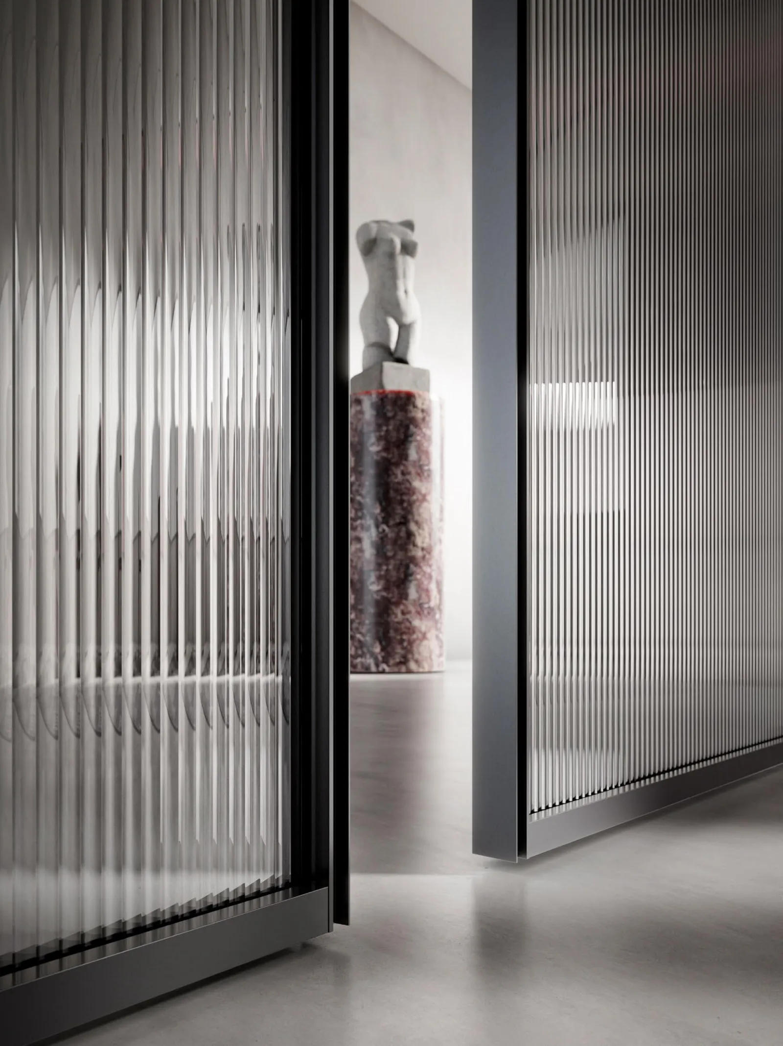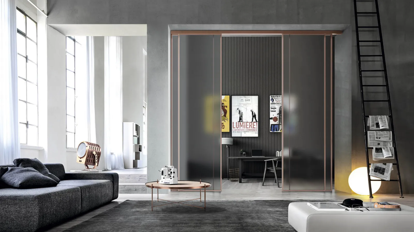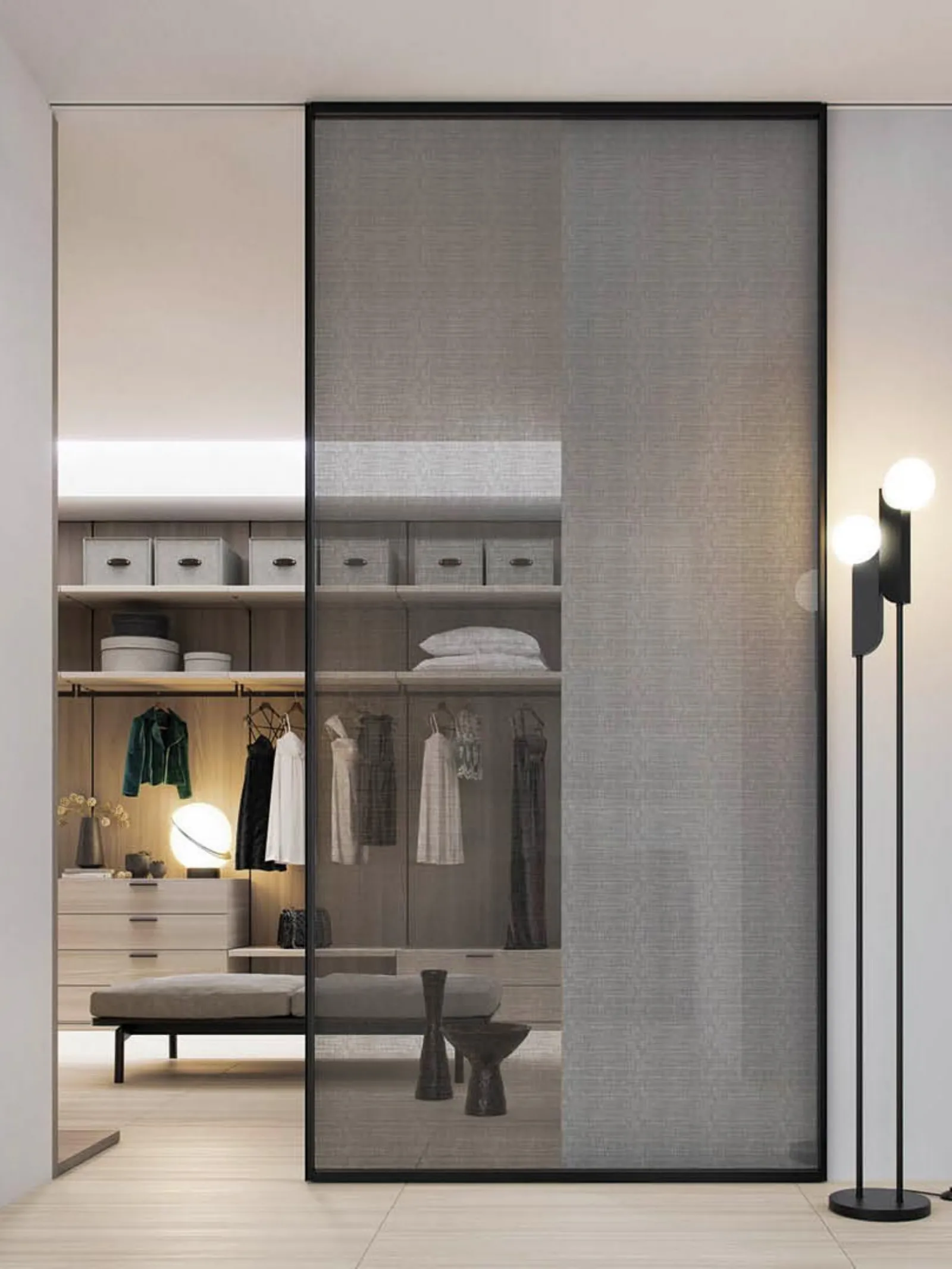 The profile with cyma moulding of the suspended sliding door LIKE, allows achieving a perfect aesthetic cleanness, since it does not involve a handle. This way, the glass is simply framed in the aluminium profile that enhances high-class glasses, such as the one on the image, with coffee linen fabric inside the glass.