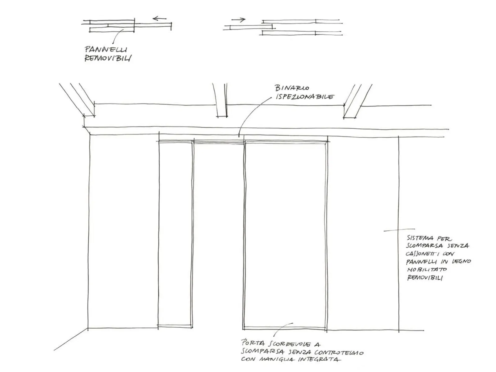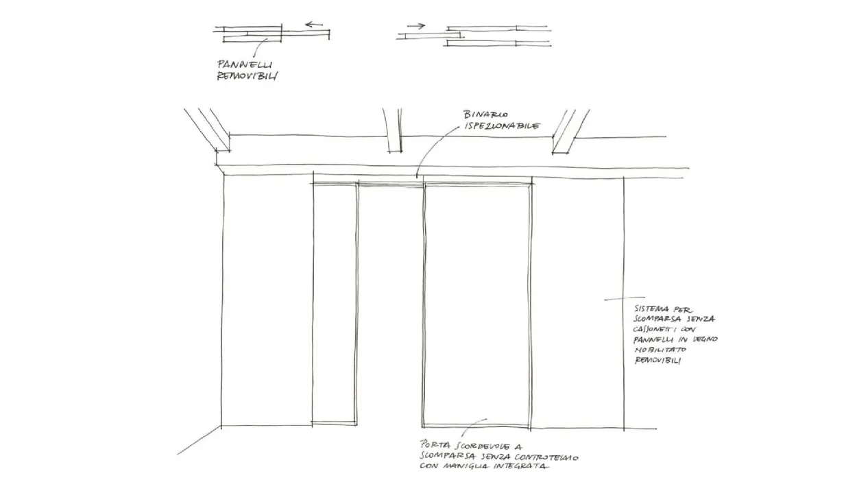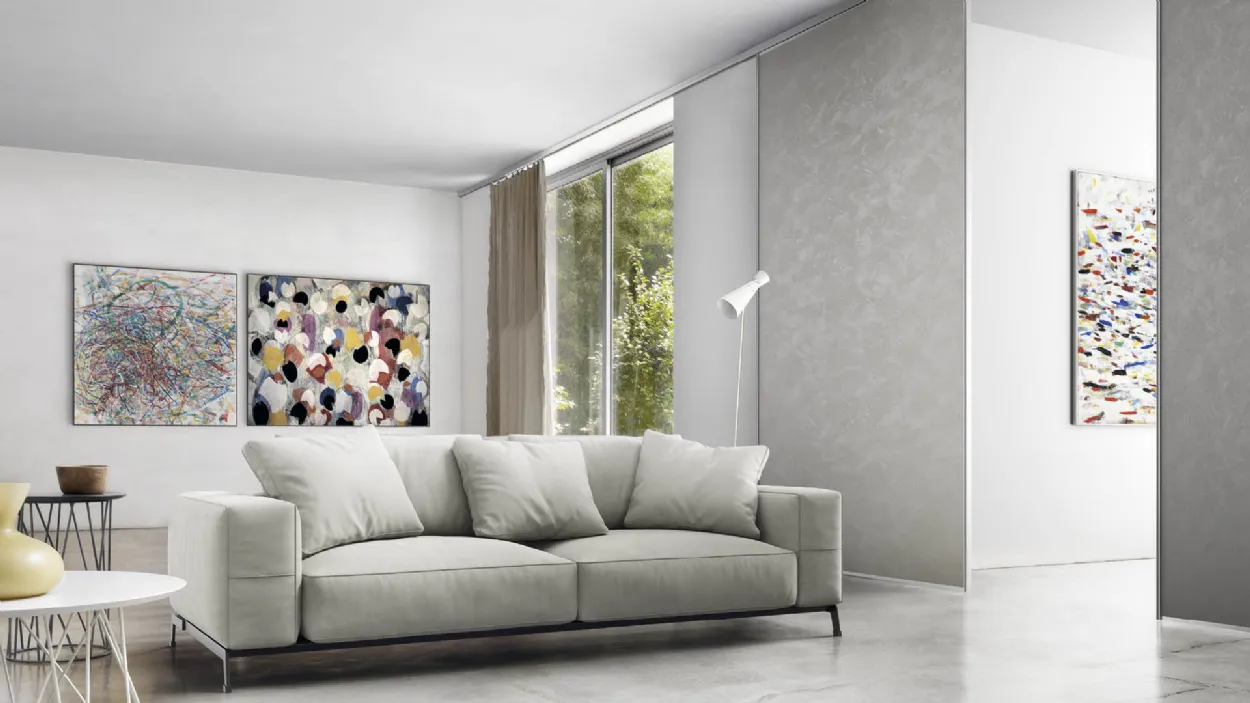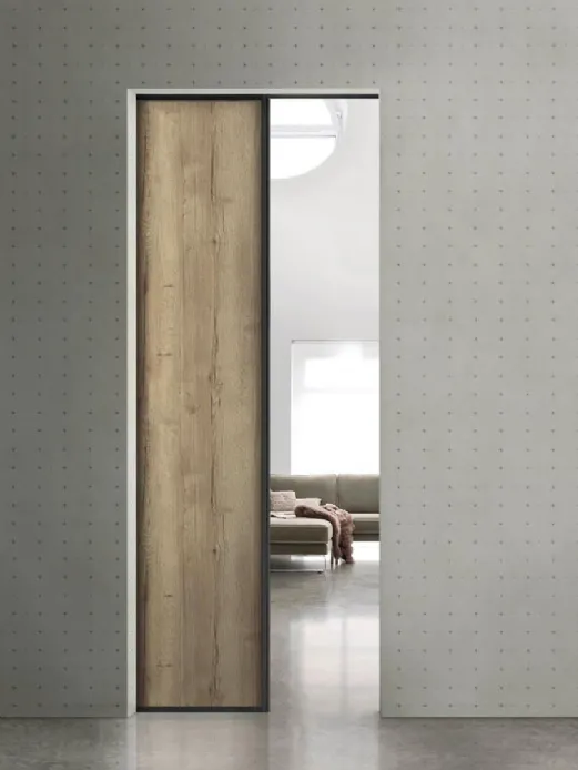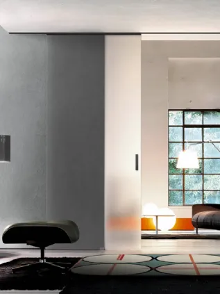 The suspended sliding door LIKE can involve the use of smooth ennobled panels, textured ones, or lacquered ones in different finishes. This solution can be ideal in situations where you want a covering effect that does not let the light pass through, yet without giving away the modern design of doors with a perimetral aluminium frame.