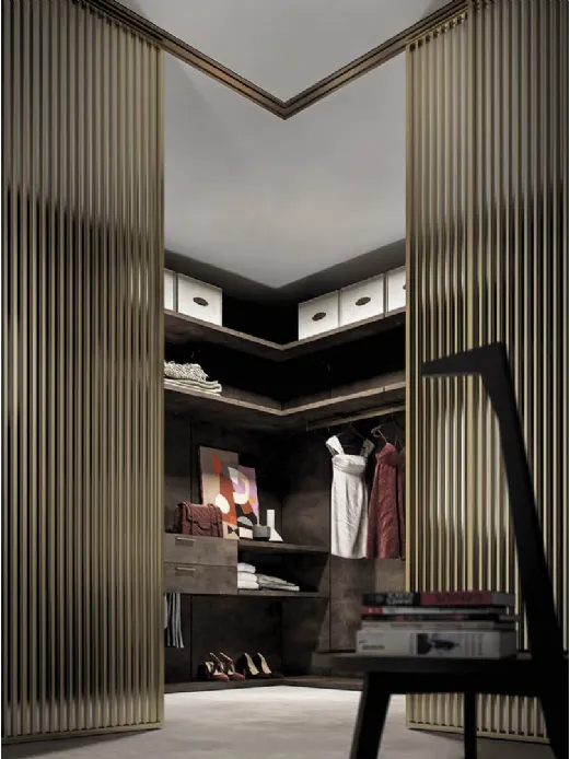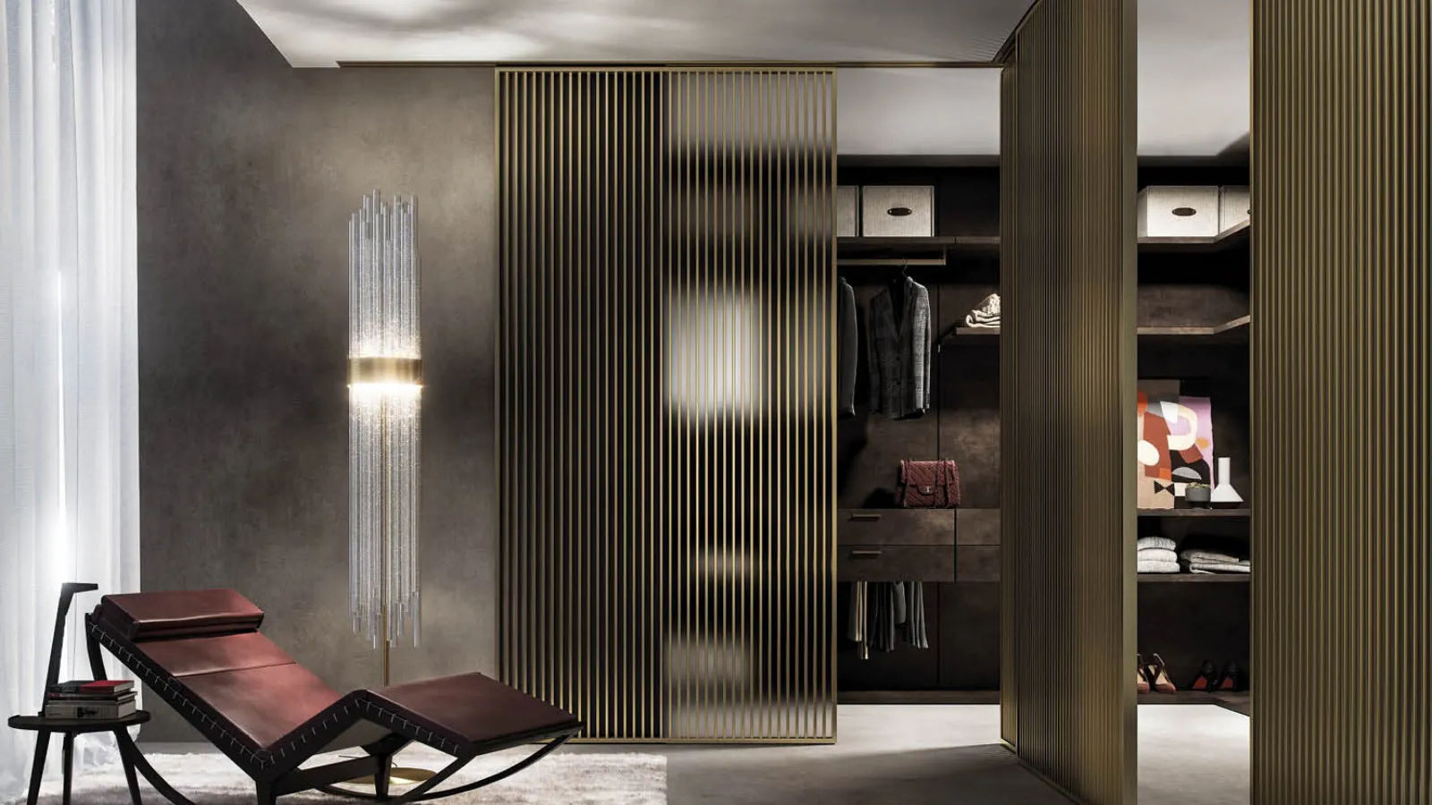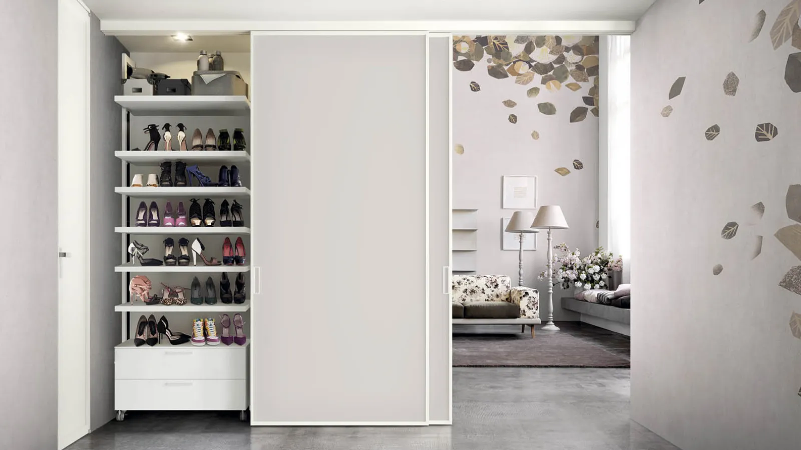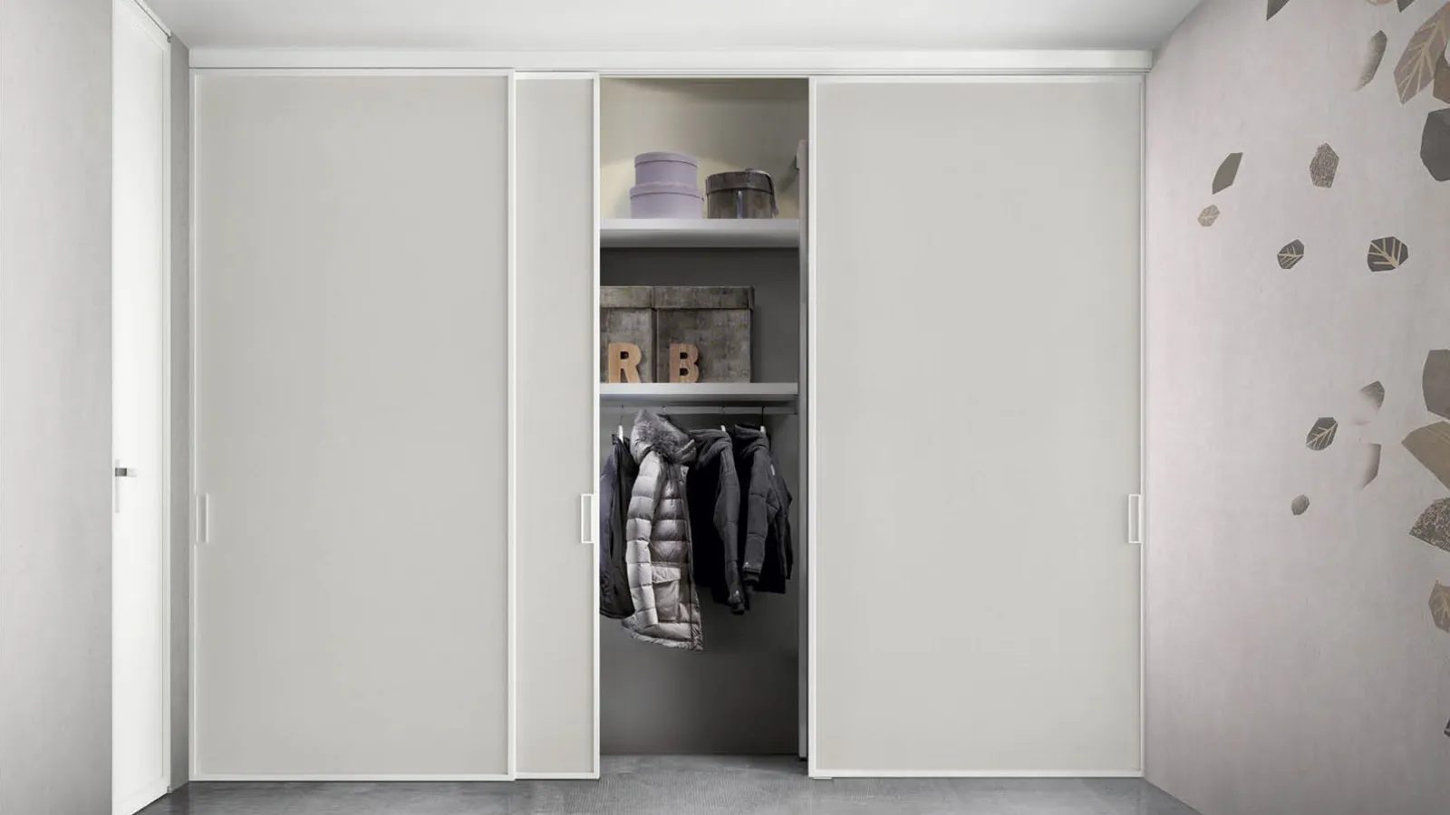 With Doal solutions, it is possible to find the perfect matching between sliding panels that close the closet and the inner equipment, supported by aluminium pillars that are available in the same finishes as the panels ones, matching coat hangers, handles, and hardware.