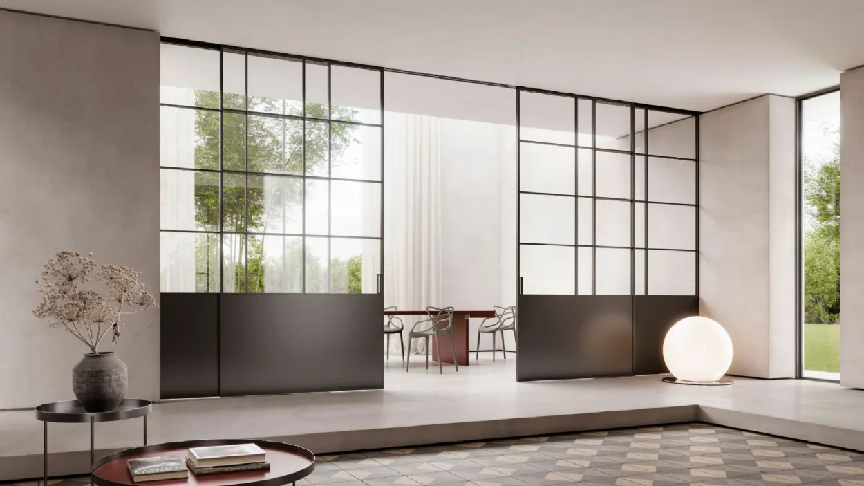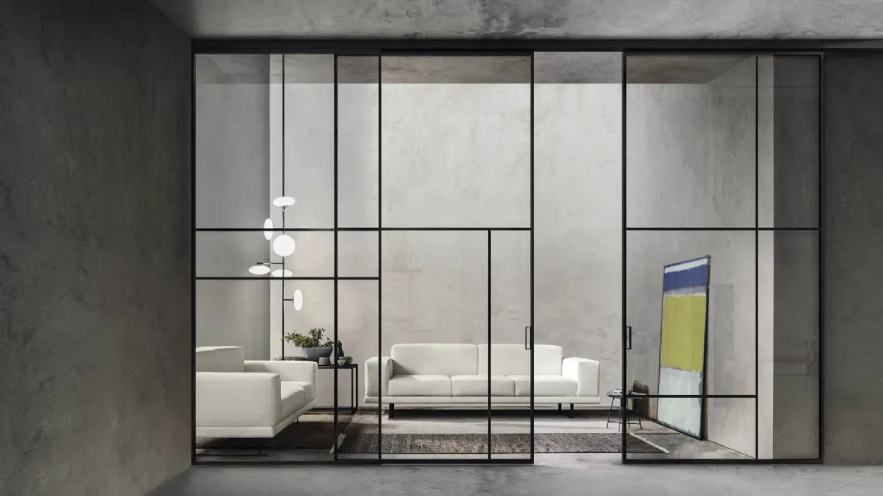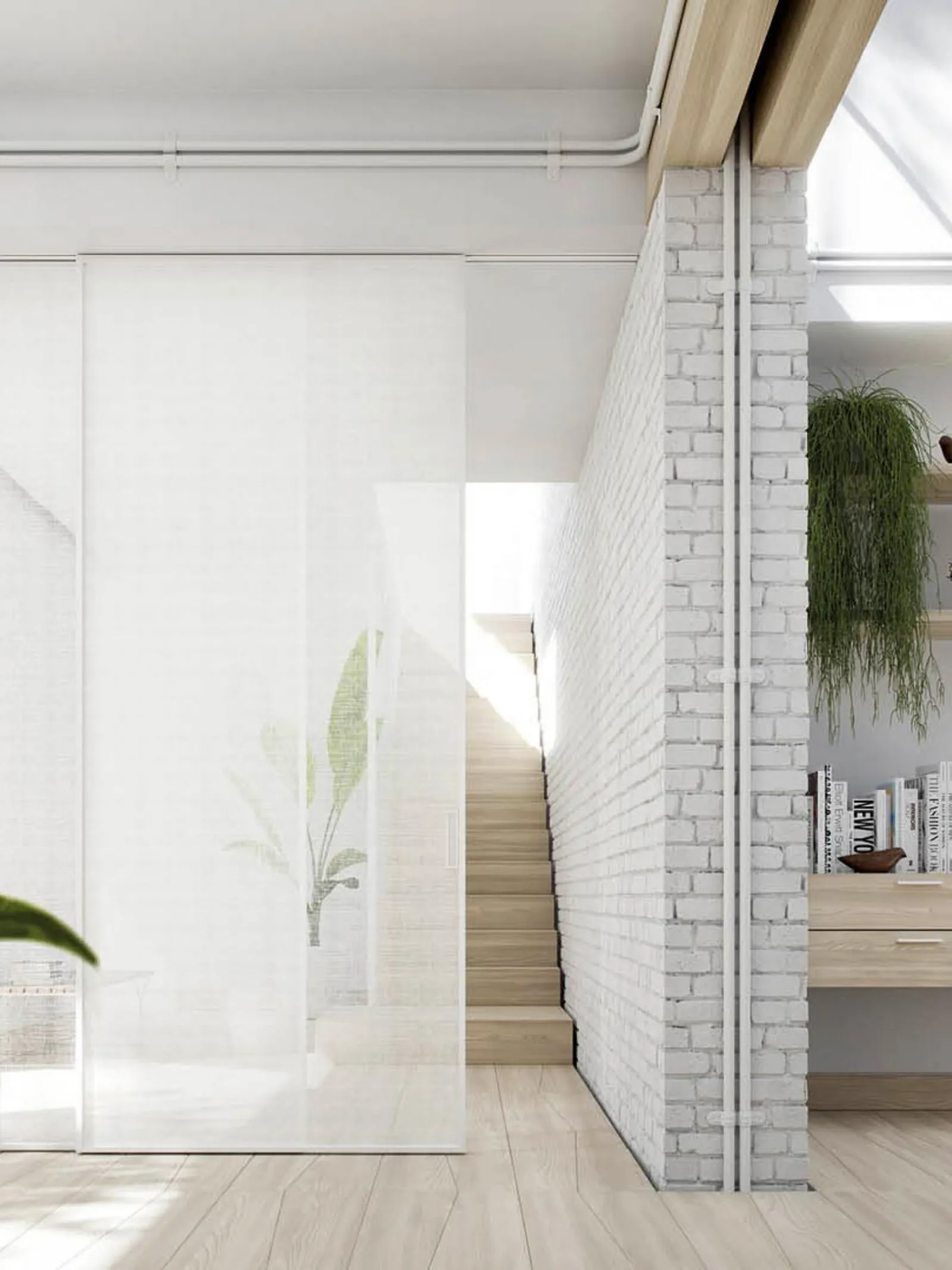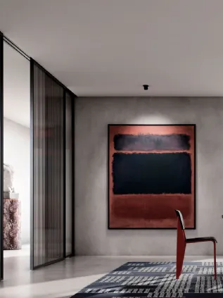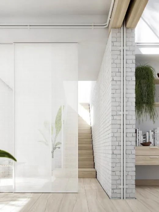 Suspended sliding ZEUS offers various glass customization possibilities, as for example inserting a fabric inside of it. This linen, from the very thin pattern, lets the light pass through and at the same time it creates a visual separation between two environments. The handle Fly, installed on the glass, creates a very thin mark to let the glass as clean as possible.