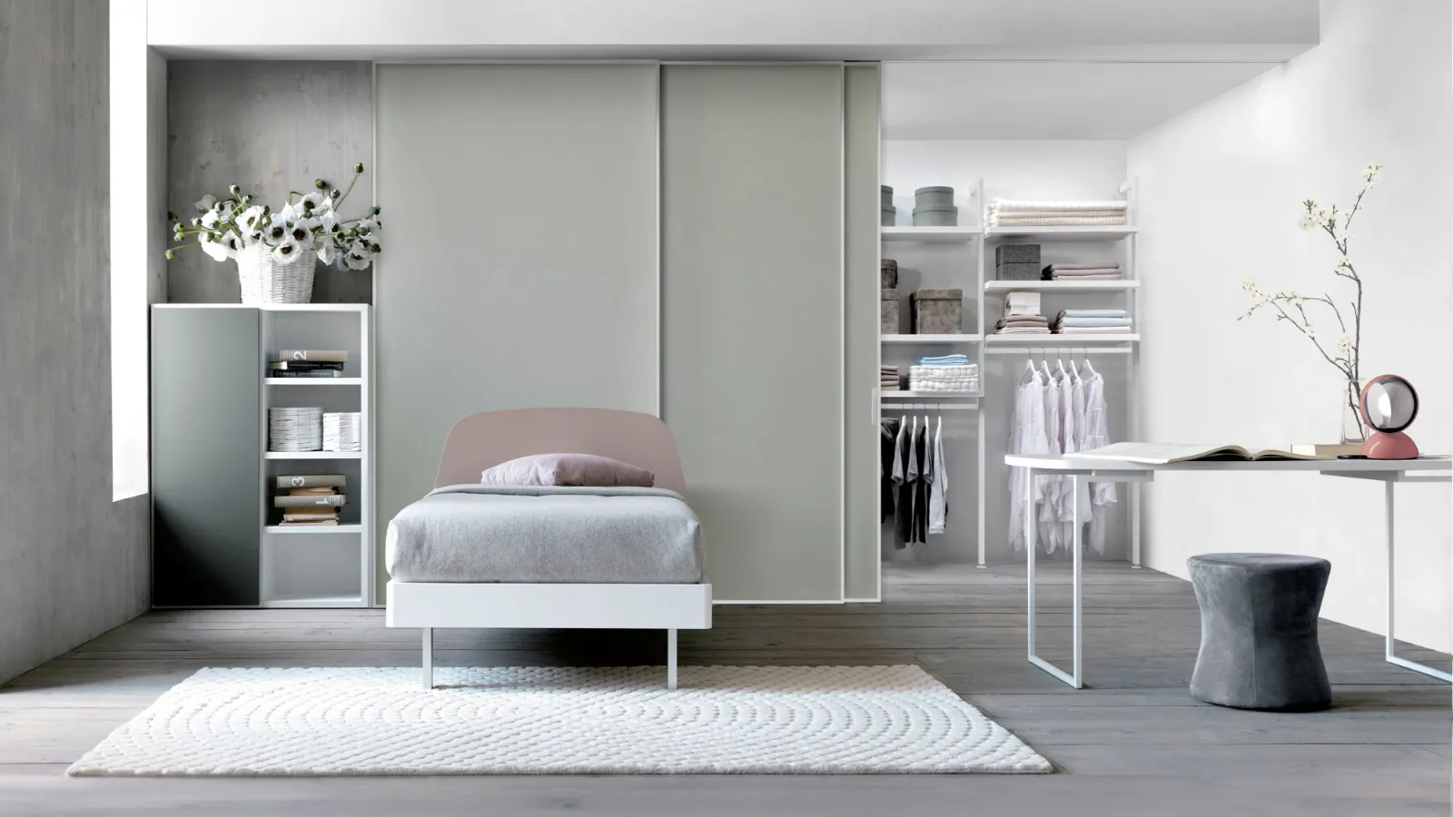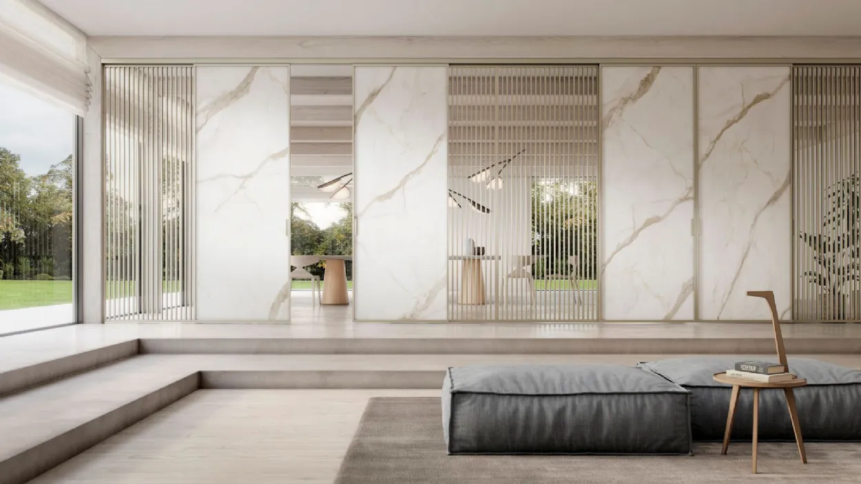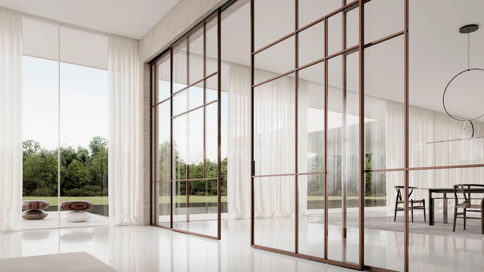 Suspended sliding ZEUS offers various glass customization possibilities, as for example inserting a fabric inside of it. This linen, from the very thin pattern, lets the light pass through and at the same time it creates a visual separation between two environments. The handle Fly, installed on the glass, creates a very thin mark to let the glass as clean as possible.