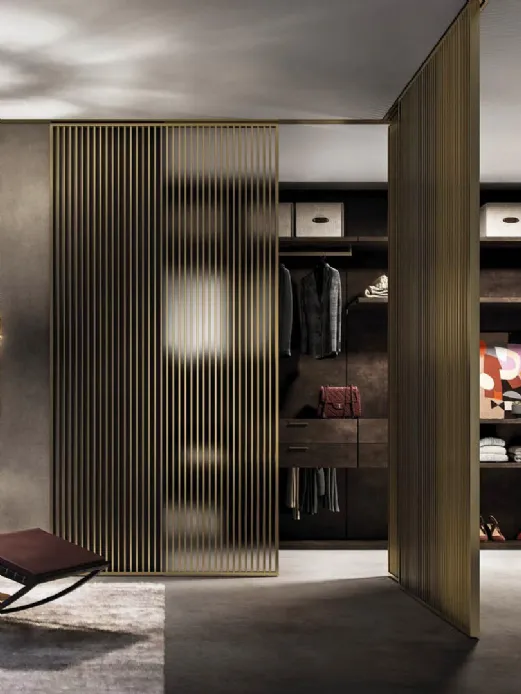 Sliding door ZEUS can be highly characterized by the use of decorative sleepers that create unique geometries, as in the case of the TOKYO model, with vertical sleepers on the entire door. This way, doors can mask the interior of a walk-in closet, also creating a corner thanks to the specifically moulded rail, that can be visible or recessed in the false ceiling.