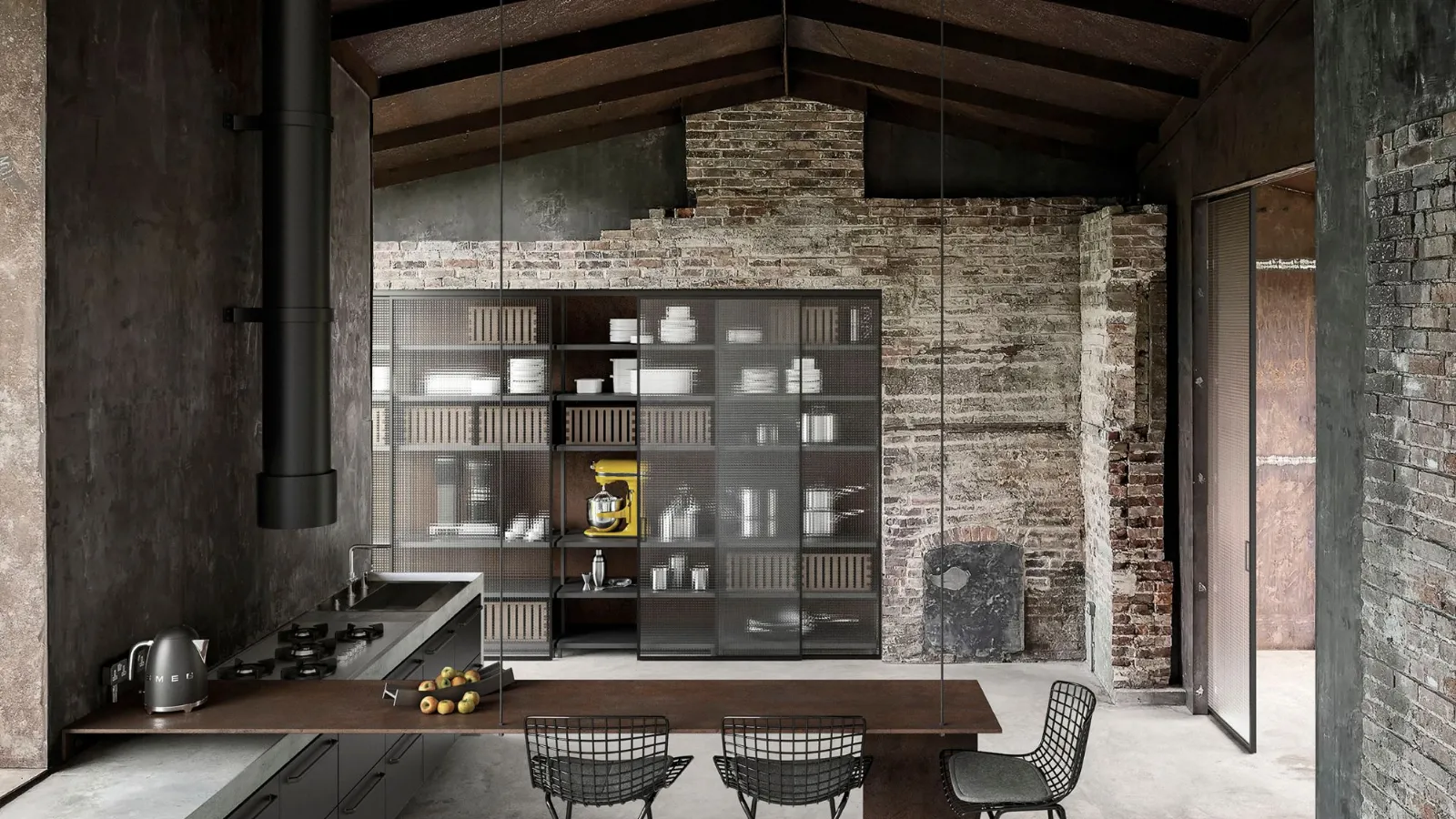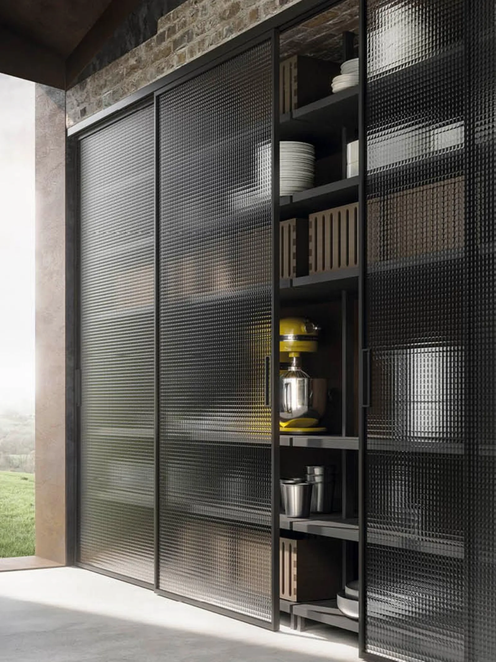 Suspended sliding ZEUS is ideal also for closing a kitchen pantry, to make it become a furniture element thanks to the usage of sliding doors with glasses that hide the interior without covering it all, as in the case of the Pixel glass on the image. This way, a perfectly tailored pantry is created, that is elegant and functional.